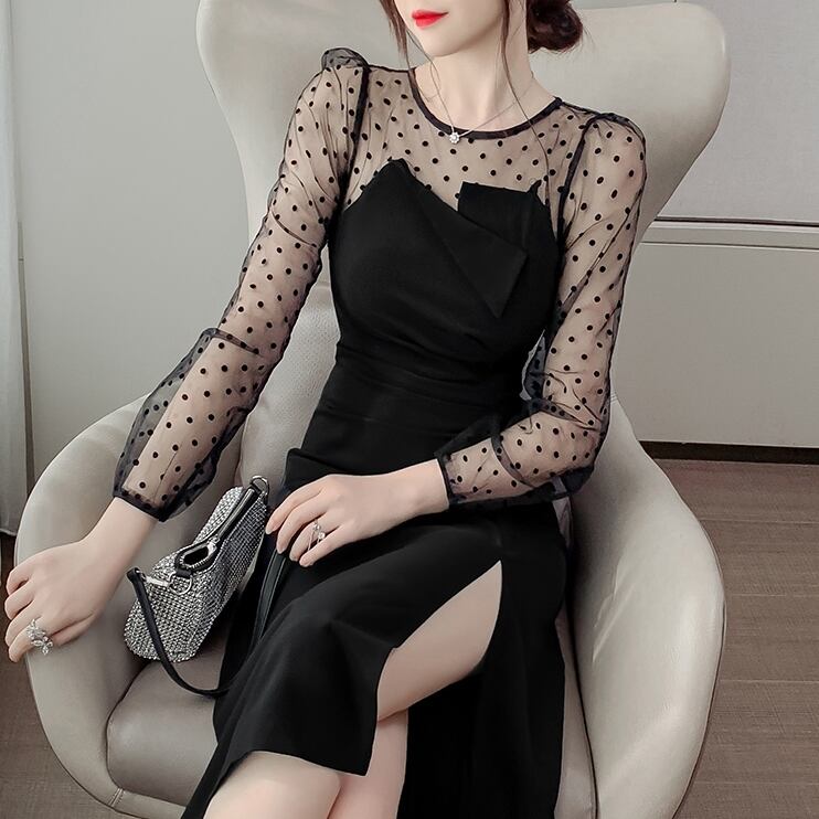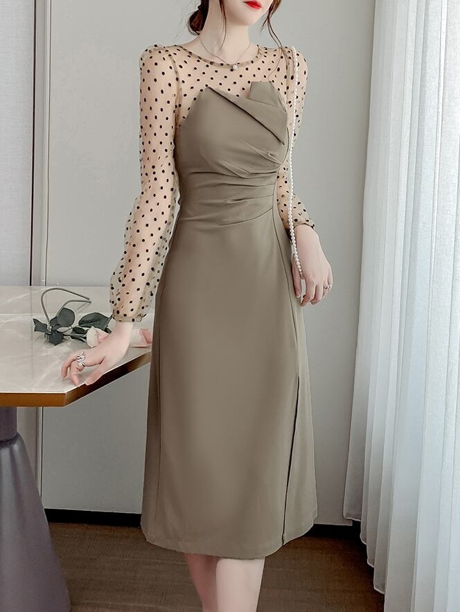 【2色】ドット ワンピース ドレス シースルー スリット パーティードレス 二次会ドレス 膝下 袖あり 七分袖 ラウンドネック 襟なし Iライン スレンダーライン ポリエステルエレガント きれいめ華やか サイズ S M L XL ブラック ベージュ ウェディング ブライダル 結婚式 二次会 1.5次会 10代 20代 30代 レディース イベント 送料無料
