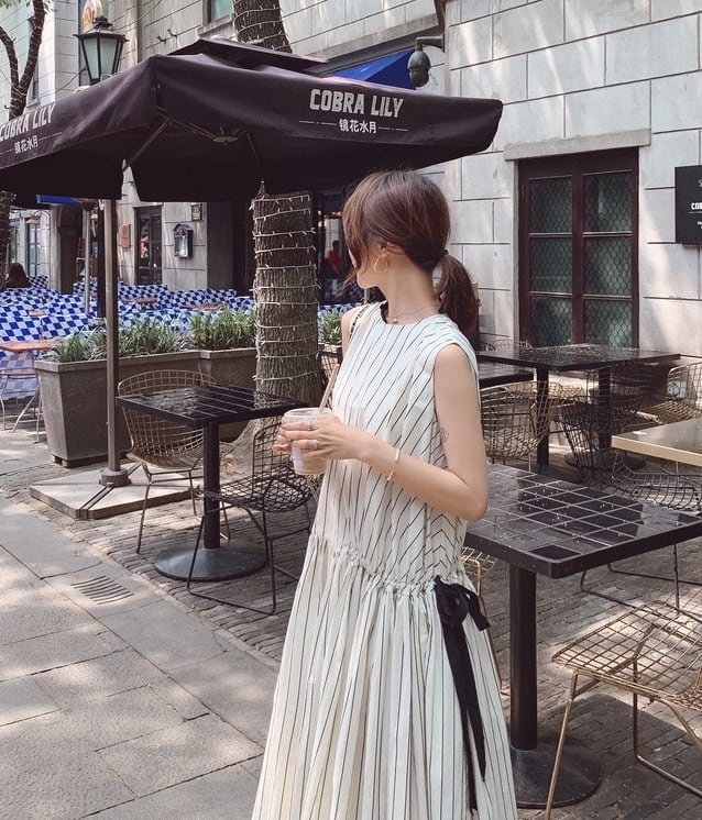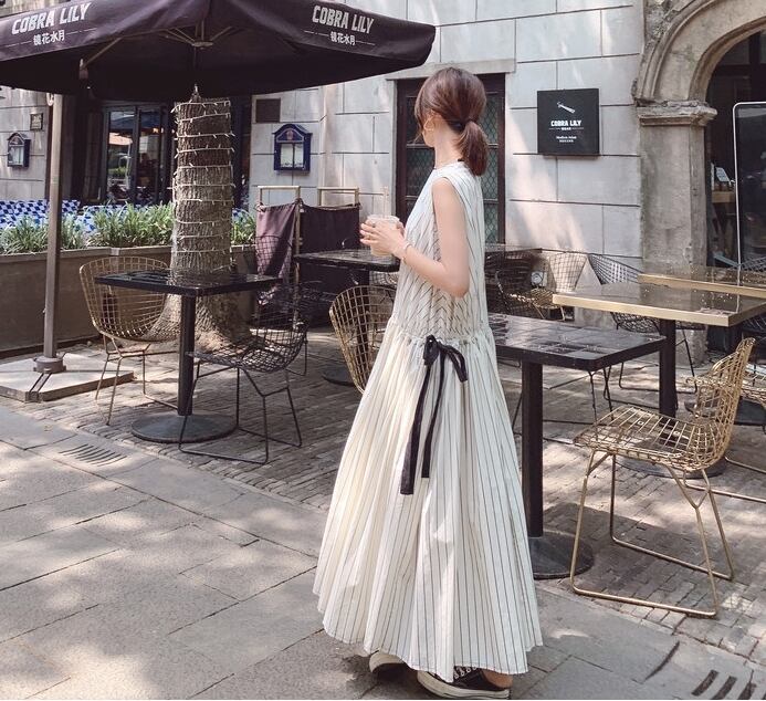 レディース ワンピース ノースリーブ ストライプ リボン シャツワンピース アンクル丈 袖なしラウンドネック Aライン 綿 かわいい キュートカジュアル ゆったりサイズ S M L XL ホワイト 春 夏デートお出かけ 10代 20代 30代 普段使い 韓国系 送料無料