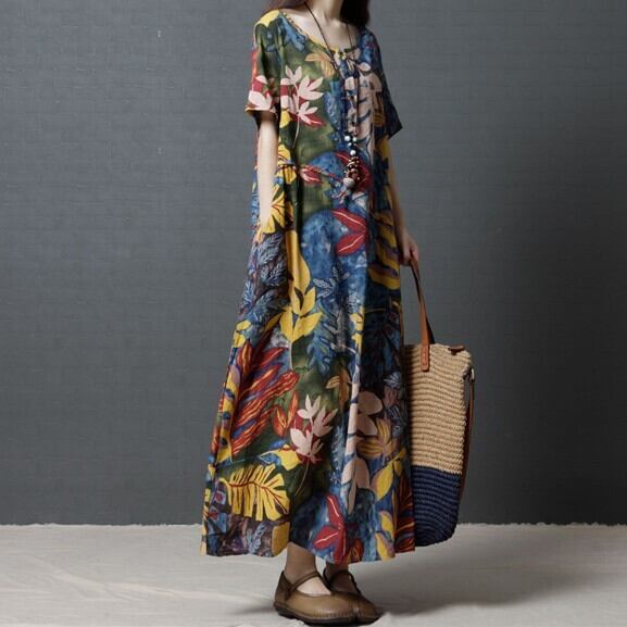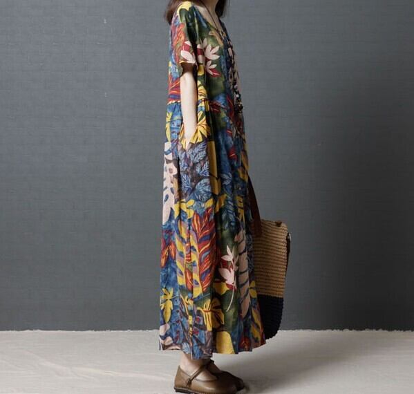 ワンピース レディース ロングワンピース M L XL ブルー 青 カラフル マルチカラー 大人カラー 鮮やか ボタニカル柄 ボタニカル 葉 春 夏 半袖 ラウンドネック 綿 コットン ロング丈 ロング アンクル丈 膝下 フレア Aライン ルーズ ゆったり ゆる オーバーサイズ 着やせ スタイルアップ 体型カバー ママ マタニティ フェミニン カジュアル きれいめ きれカジ ナチュラル 大人 大人可愛い リラックス 休日 お出かけ デート 存在感 主役級 リゾート アジアン エスニック 華やか オルチャン