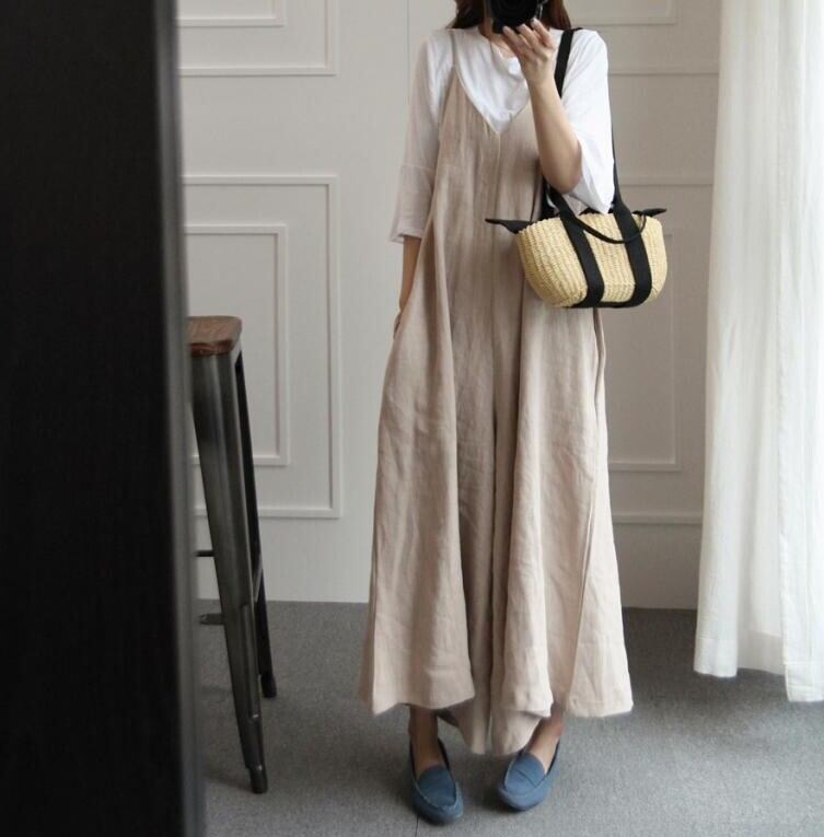 オールインワン レディース サロペット オーバーオール ジャンプスーツ ネイビー 紺 ベージュ 春 夏 S M L XL 無地 リネン Vネック 袖なし ノースリーブ ワイドレッグ パンツ ワイドパンツ フレアシルエット ゆったり ゆる ルーズ 体型カバー ママ マタニティ カジュアル きれいめ きれカジ ナチュラル リラックス 大人 大人可愛い 存在感 主役級 旅行 ロング丈 ロング アンクル丈 学生 通学 休日 お出かけ デート 定番 着回し 万能 シンプル ベーシック レイヤード 重ね着 オルチャン
