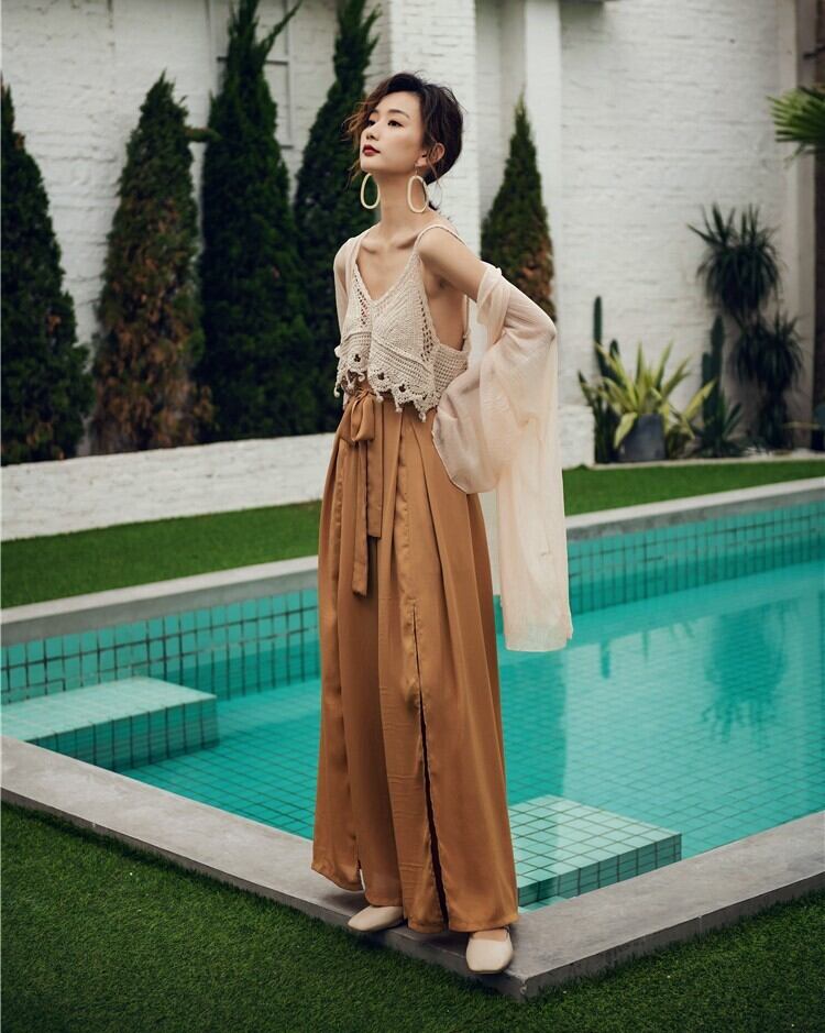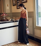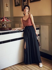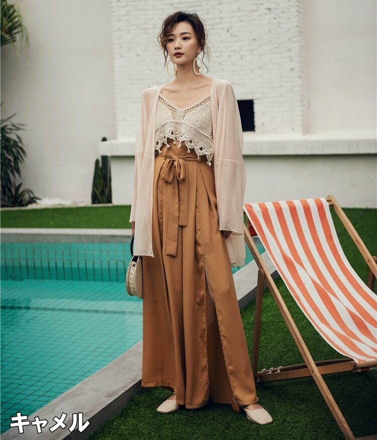 ロング丈のスリットが目をひくワイドパンツ。