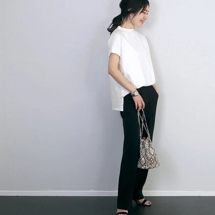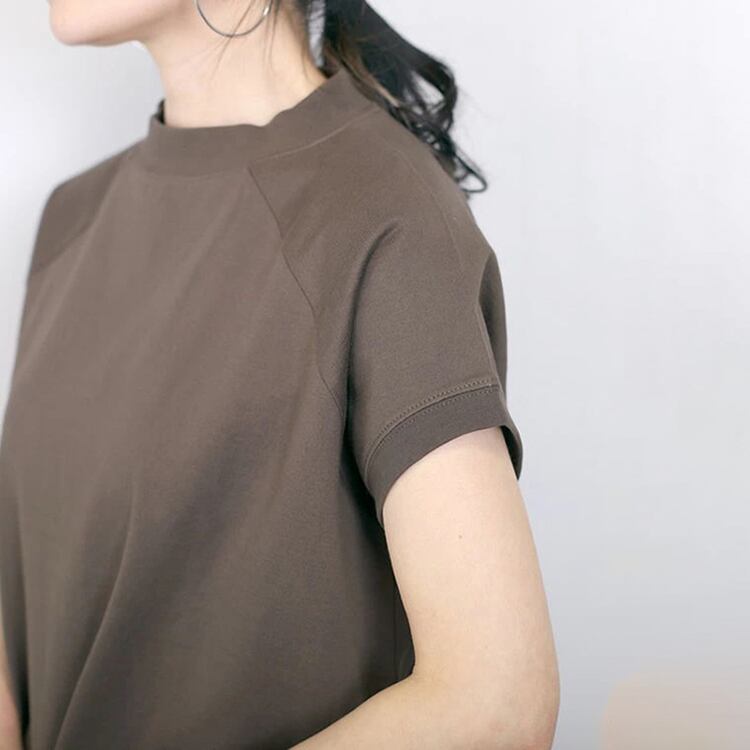 露出抑えめのモックネックとフレンチスリーブが上品な印象◎