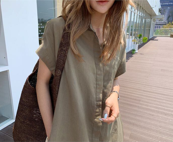 ミモレ丈の半そでシャツワンピース。
