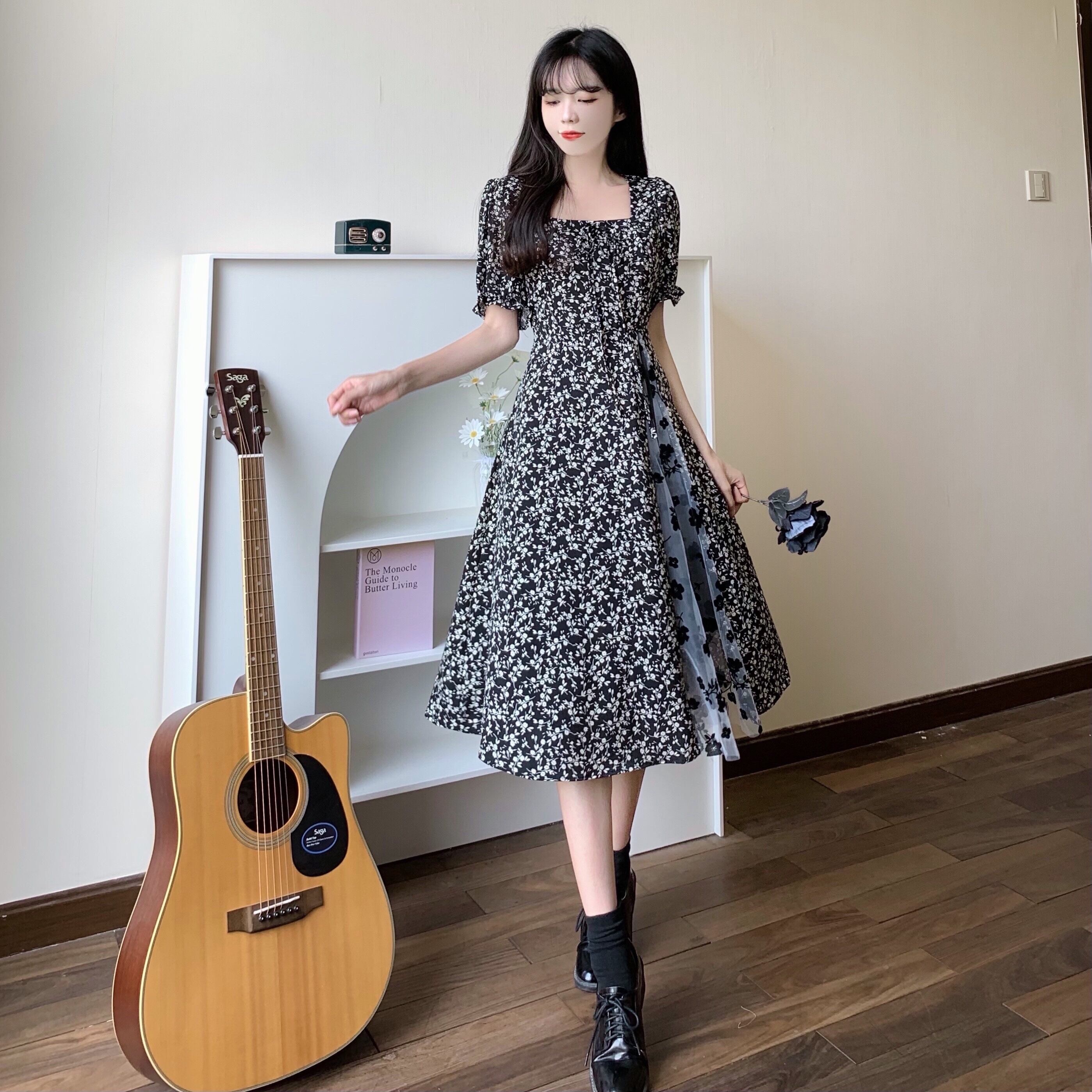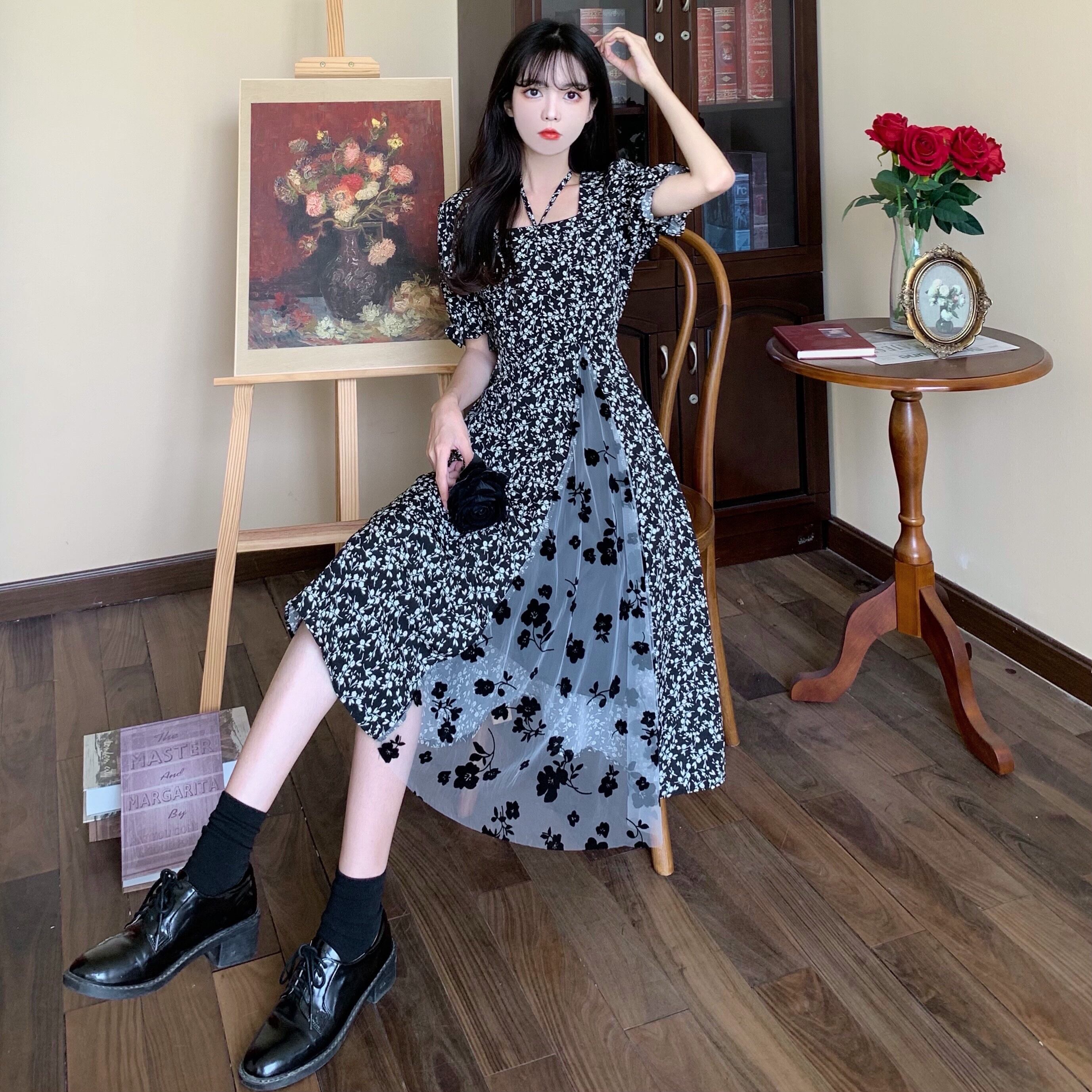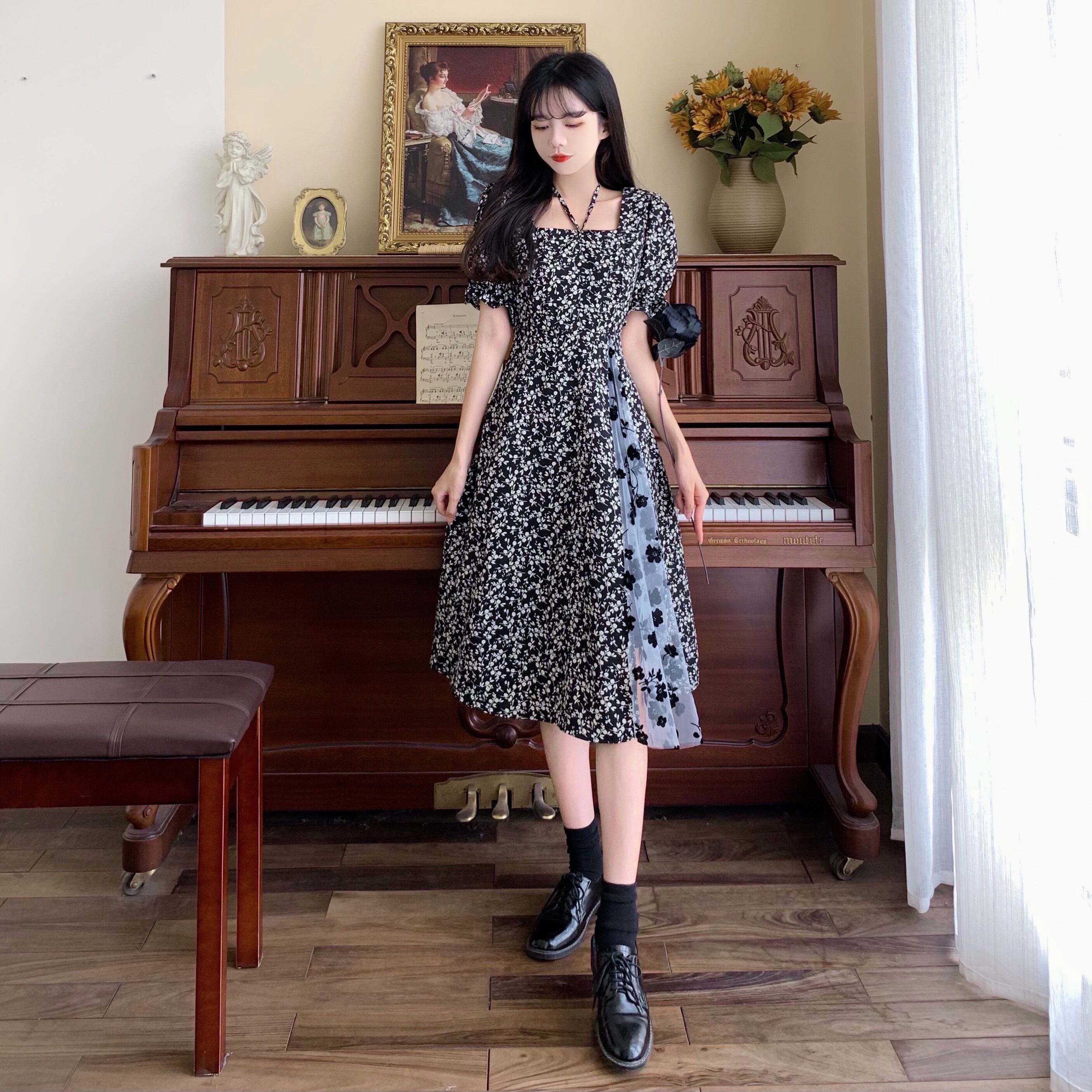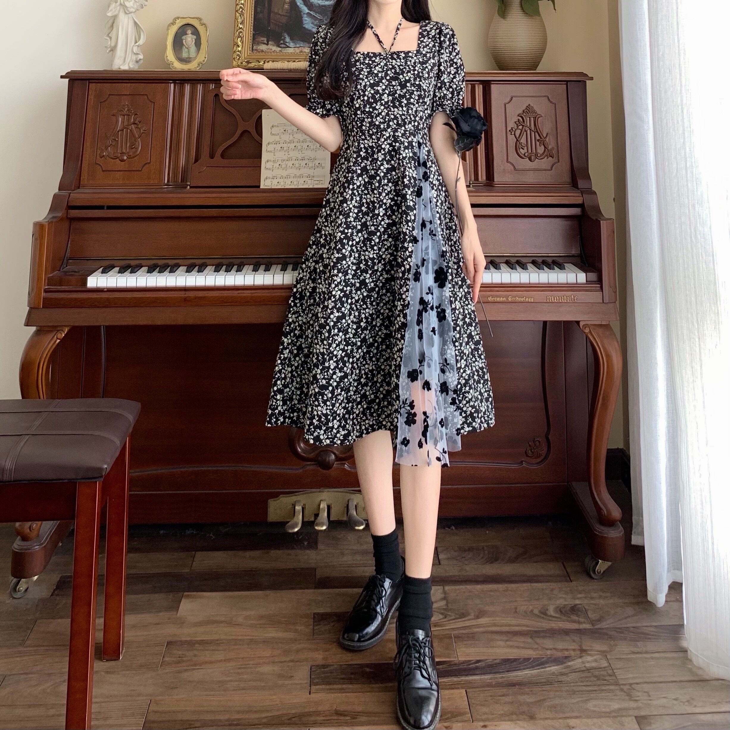 ワンピース レディース ドッキングワンピース フレアワンピース ミディアム丈 袖あり 半袖 パフスリーブ 萌袖 スクエアネック フレア Aライン 切り替えデザイン シースルー 異素材MIX かわいい 上品 おしゃれ キュート ラブリー ガーリー とろみ感 M L XL 2XL 3XL 4XL 大きいサイズ 黒 ブラック 花柄 フラワープリント 夏 10代 20代 30代 デート お出かけ 女子会 休日 パーティー イベント リゾート 旅行