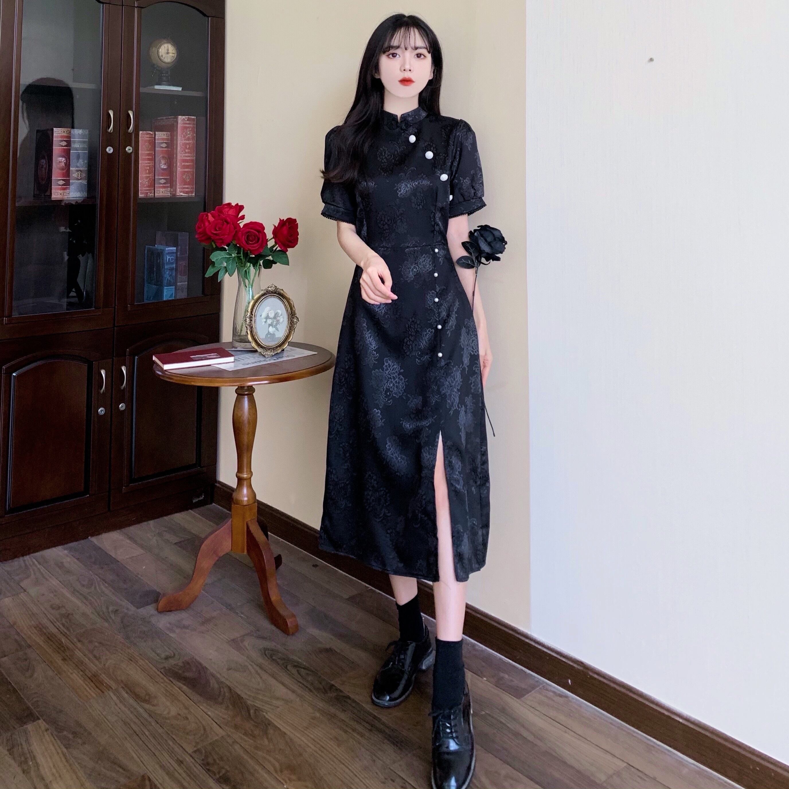 ワンピース レディース ワンピドレス チャイナドレス風 ミモレ丈 袖あり 半袖 パフスリーブ 萌袖 スタンドカラー Iライン ストレート 着痩せ 着やせ スリット 大人 上品 おしゃれ かっこいい アジアン エキゾチック 個性的 クール セクシー 主役級 存在感 M L XL 2XL 3XL 4XL 大きいサイズ 黒 ブラック 花柄 夏 謝恩会 二次会 10代 20代 30代 40代 50代 デート お出かけ お呼ばれ 女子会 パーティー イベント 中国 中華 美脚