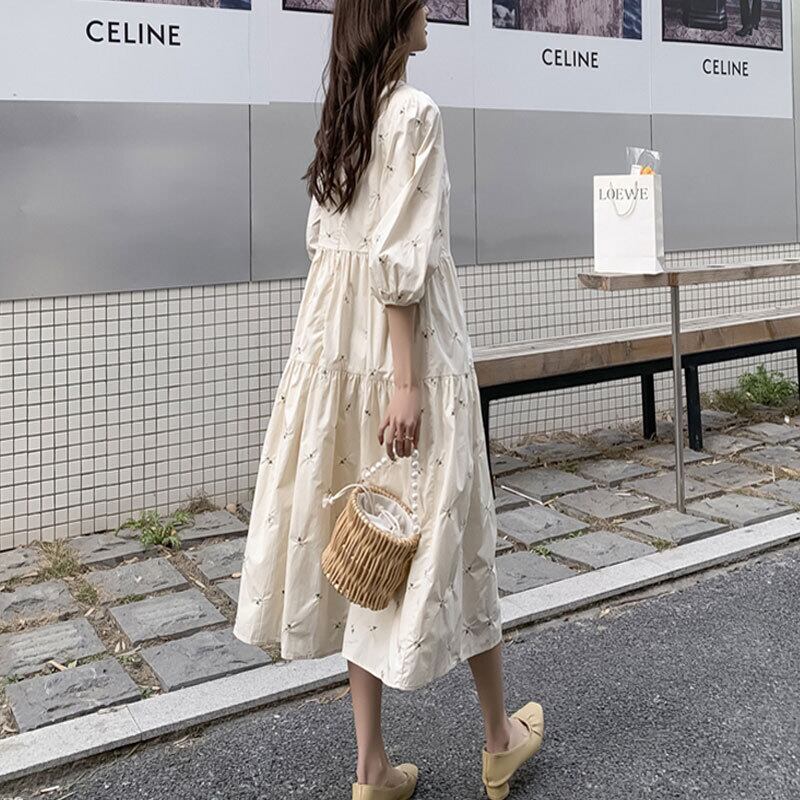 ワンピース レディース ティアードワンピース 膝下 膝下丈 ミディアム丈 ミディ丈 袖あり 7分袖 七分袖 パフスリーブ 萌袖 Vネック ギャザー 刺繍 かわいい レトロ ラブリー キュート ガーリー 主役級 存在感 M L XL 2XL 3XL 大きいサイズ ゆったり ゆる 白 ホワイト 花柄 小花柄 フラワー 春 夏 10代 20代 30代 ママ マタニティ 女性用 デート お出かけ 女子会 休日 旅行 楽ちん 体型カバー