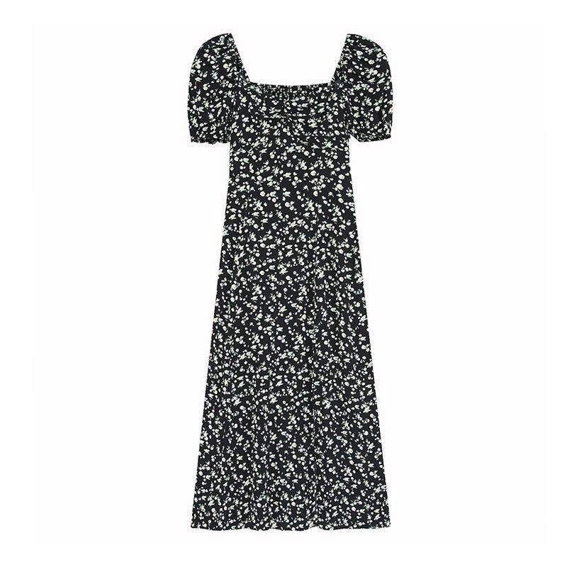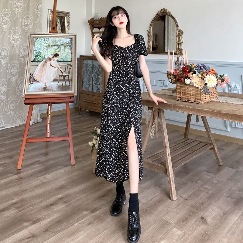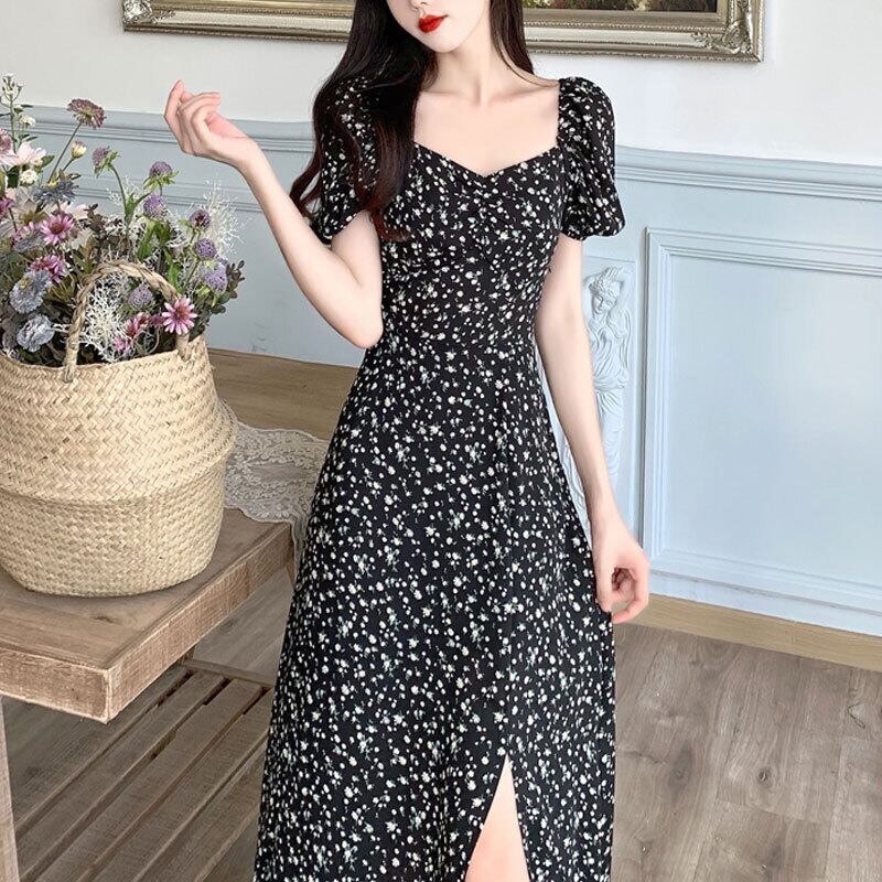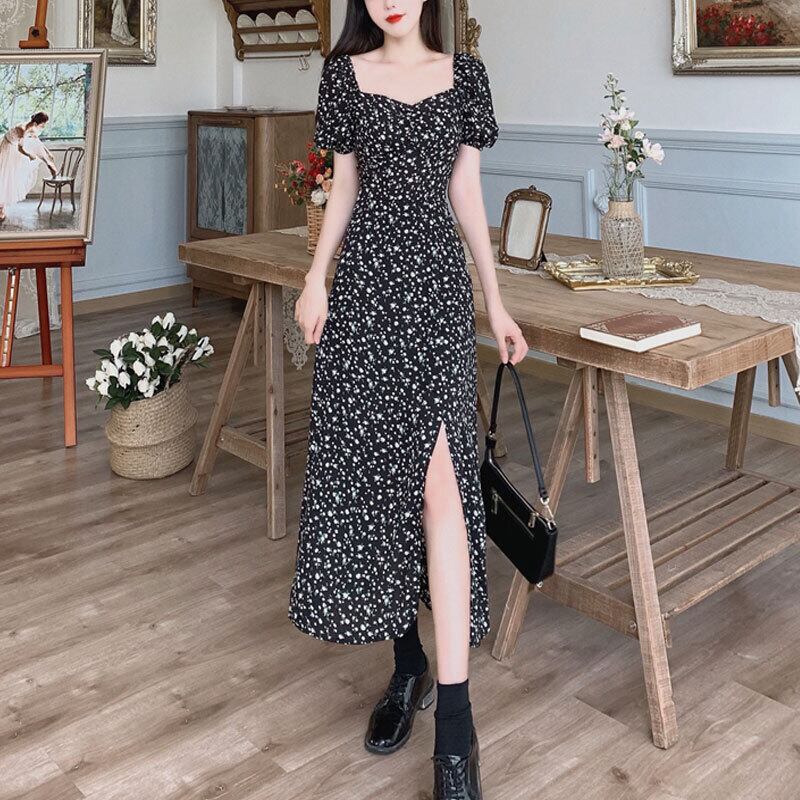 ワンピース レディース フレアワンピース ロング丈 袖あり 半袖 パフスリーブ 萌袖 ペンタゴンネック 襟なし Aライン セミフレア スリット かわいい 大人可愛い きれいめ 上品 大人 セクシー おしゃれ レトロ 大人女子 ラブリー 存在感 とろみ感 M L XL 2XL 3XL 4XL 大きいサイズ 黒 ブラック 花柄 小花柄 フラワー 夏 10代 20代 30代 40代 女性用 デート お出かけ 女子会 休日 パーティー お呼ばれ モテ 美脚