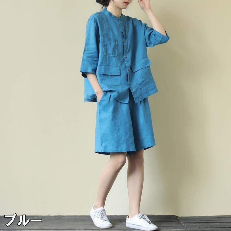 セットアップ レディース セット 2点セット ツーピース M L XL 2XL 3XL 大きいサイズ プラスサイズ ピンク ブルー 青 大人カラー くすみカラー トップス シャツ ブラウス 半袖 五分袖 5分袖 無地 ノーカラー ポケット ボトムス パンツ ハーフパンツ ショートパンツ 膝丈 ルーズ ゆったり ゆる リラックス フェミニン ナチュラル 大人 大人可愛い きれいめ きれカジ カジュアル クール ボーイッシュ マニッシュ 万能 着回し シンプル ベーシック こなれ感 ぬけ感 存在感 主役級