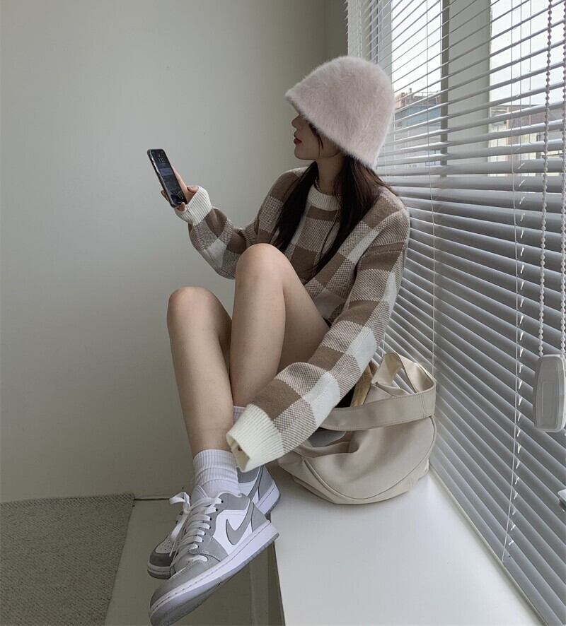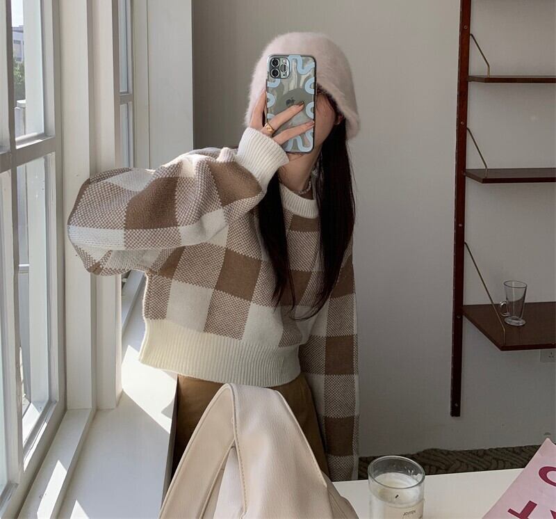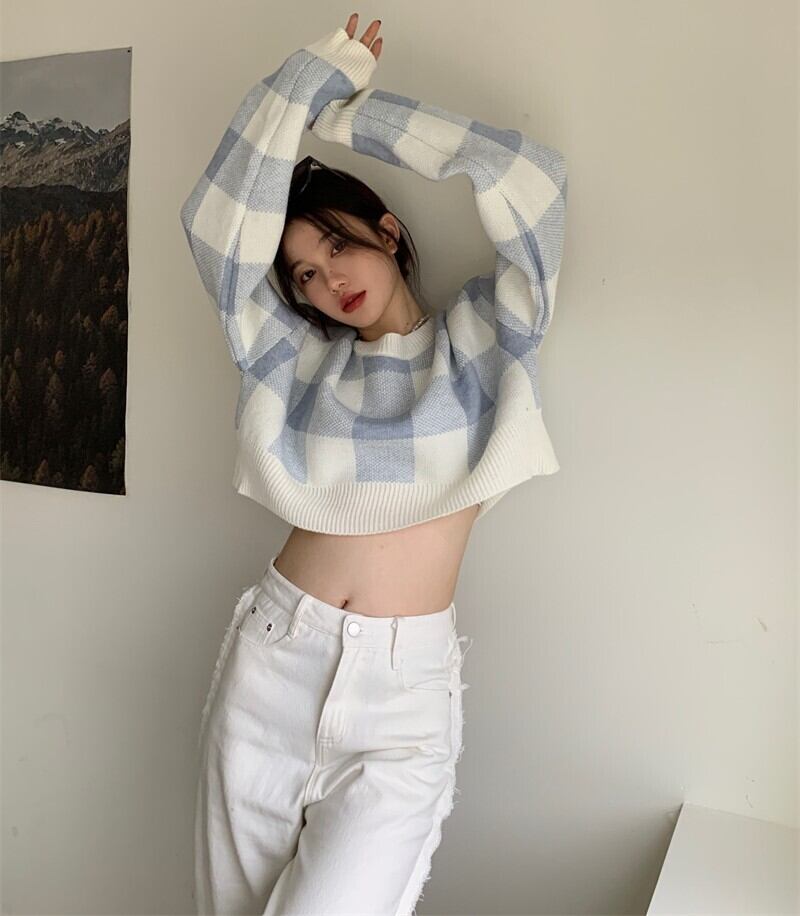 ニット レディース トップス セーター ワンサイズ フリーサイズ ブルー 青 カーキ 大人カラー くすみカラー 秋カラー パステルカラー チェック クロップド クロップド丈 ショート丈 ショート 秋 冬 長袖 ラウンドネック クルーネック ママ フェミニン ナチュラル カジュアル きれいめ きれカジ 大人 大人可愛い こなれ感 ぬけ感 存在感 主役級 キュート ガーリー 休日 お出かけ デート ゆったり ゆる シンプル ベーシック 王道 万能 定番 着回し 韓国 オルチャン 学生 通学 10代 20代