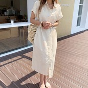 ワンピース レディース シャツワンピース ロング丈 袖あり 半袖 フレンチスリーブ 襟付き Iライン ウエストマーク ウエストリボン きれいめ シンプル カジュアル 大人 上品 おしゃれ お洒落 かっこいい 大人女子 こなれ感 ラフ 抜け感 フリーサイズ XL ライトベージュ 黒 ブラック カーキ 無地 夏 20代 30代 40代 50代 学生 通学 デート お出かけ 女子会 休日 イベント リゾート 旅行 着回し 普段使い 重ね着 モテ