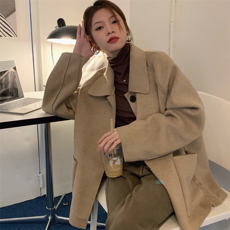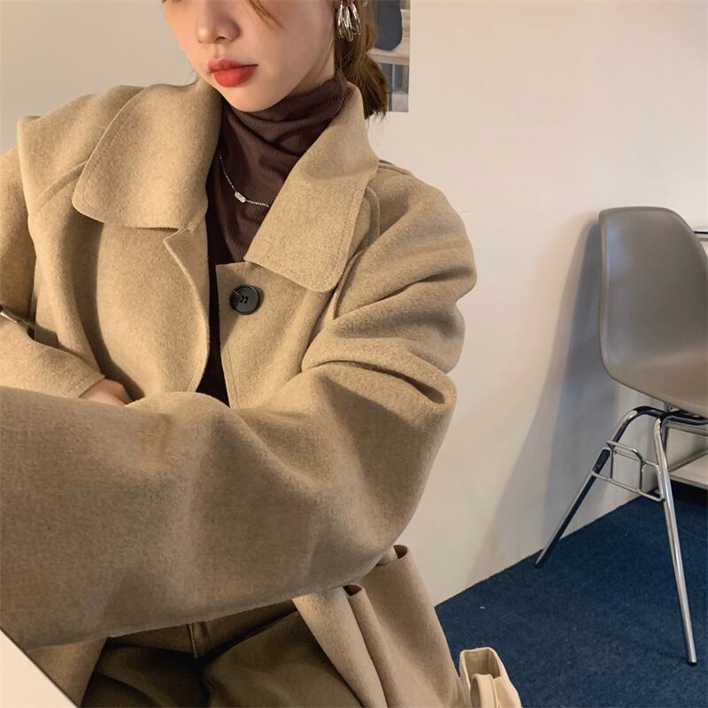 ミドル丈のオートミール色シンプルステンカラーコート。
