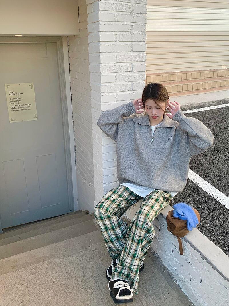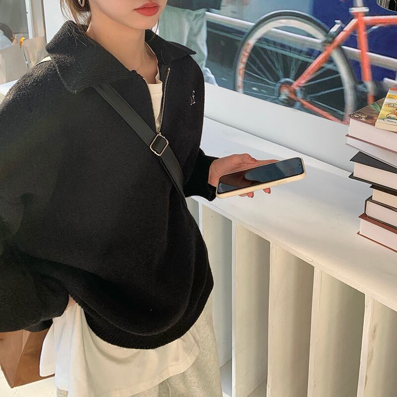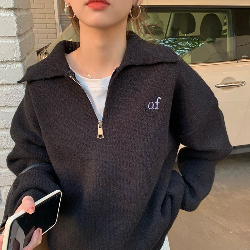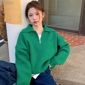 トップス レディース セーター ニット ミディアム丈 袖あり 長袖 襟付き ポロネック ポロ襟 ジッパー 刺繍ワンポイント ファスナー シンプル カジュアル 大人 おしゃれ かっこいい ラフ メンズライク クール 抜け感 フリーサイズ 緑 グリーン グレー 灰色 黒 ブラック 無地 冬 春 秋 10代 20代 30代 40代 50代 60代 男女兼用 学生 通学 お泊り 休日 アウトドア 普段使い 楽ちん あったか 暖かい 防寒