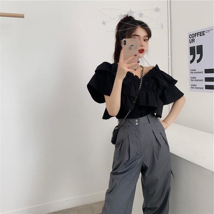 ブラウス レディース トップス カットソー シャツ M L XL ブラック 黒 大人カラー モノトーン 春 夏 無地 ショート丈 ショート コンパクト オフショルダー フリル 半袖 Vネック フェミニン ナチュラル カジュアル きれいめ きれカジ 大人 大人可愛い 上品 エレガント こなれ感 ぬけ感 存在感 主役級 休日 お出かけ デート 細身 スリム シンプル ベーシック ガーリー キュート モテ 定番 万能 着回し 王道 韓国 オルチャン 学生 通学 10代 20代 30代 ヘルシー 肌見せ ビーチ
