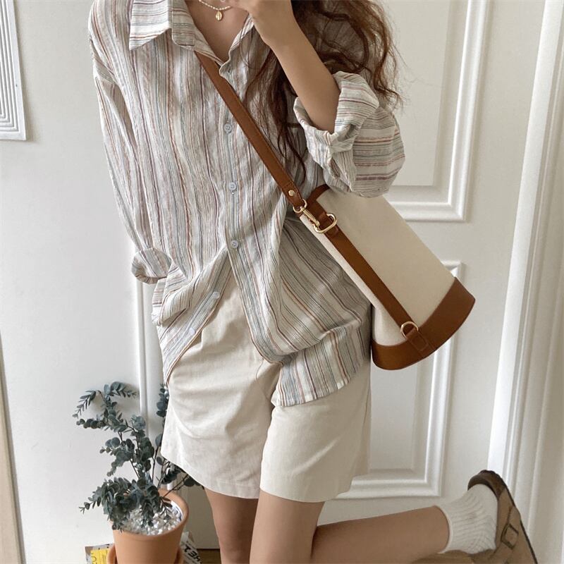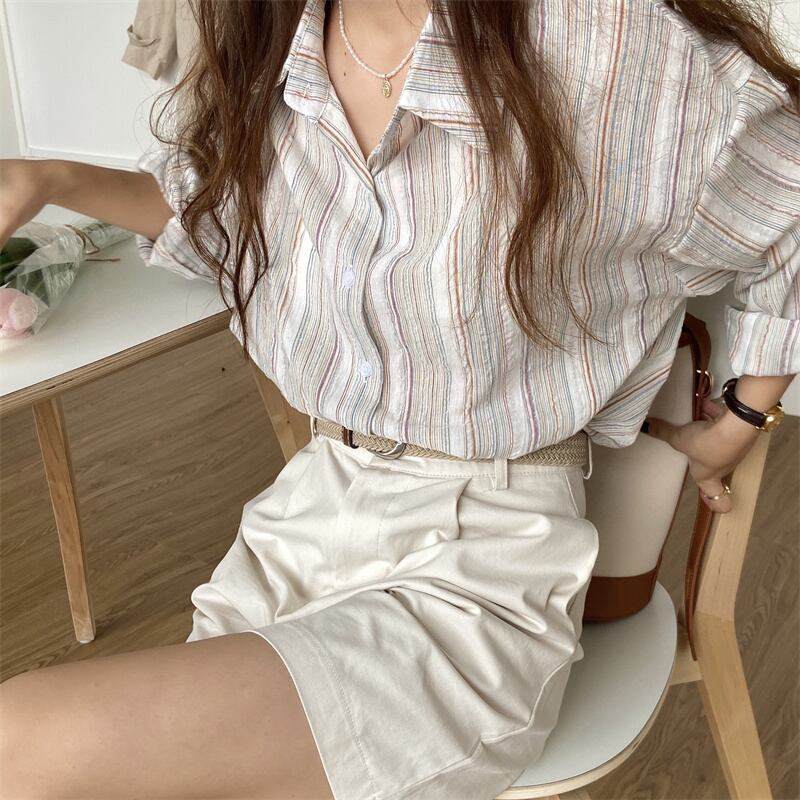 シャツ レディース トップス ブラウス ワンサイズ フリーサイズ ストライプ アースカラー 大人カラー くすみカラー 春 秋 ロング 長袖 襟付き フロントボタン フェミニン ナチュラル カジュアル きれいめ きれカジ 大人 大人可愛い こなれ感 ぬけ感 存在感 主役級 休日 お出かけ デート ルーズ ゆったり ゆる オーバーサイズ シンプル ベーシック ガーリー キュート さわやか 定番 万能 着回し 王道 学生 通学 韓国 オルチャン 体型カバー ママ 着やせ クール ボーイッシュ メンズライク