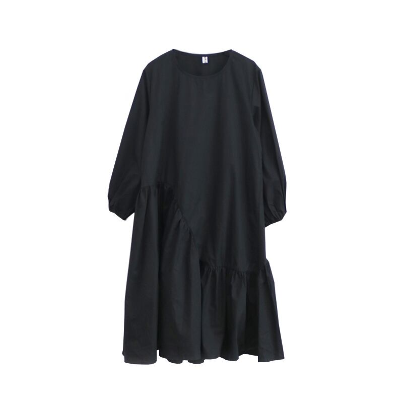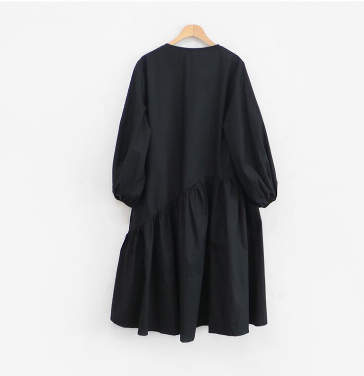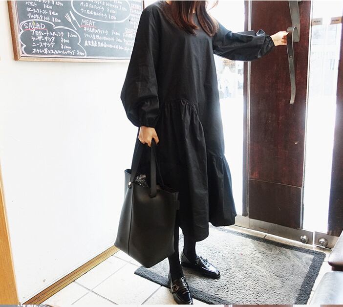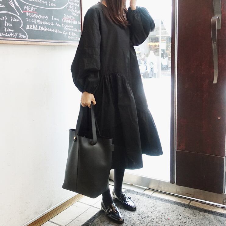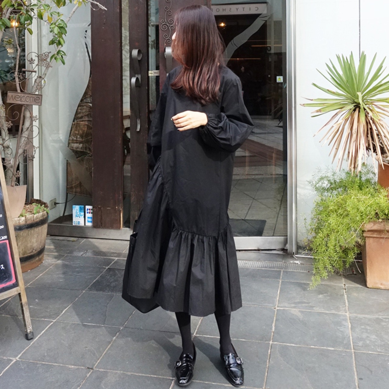 ワンピース フレアワンピース ワンピドレス ミモレ丈 長袖 ボリューム袖 襟なし フレア 大人可愛い シンプル 上品 無地 春 秋 デート お出かけ 楽ちん 体系カバー 黒 ブラック