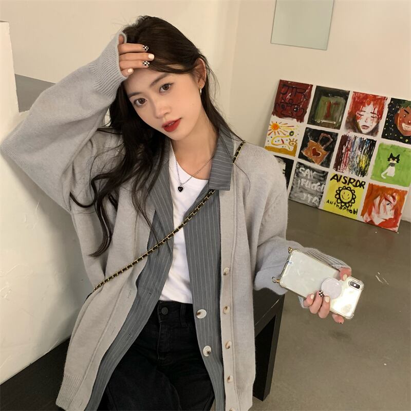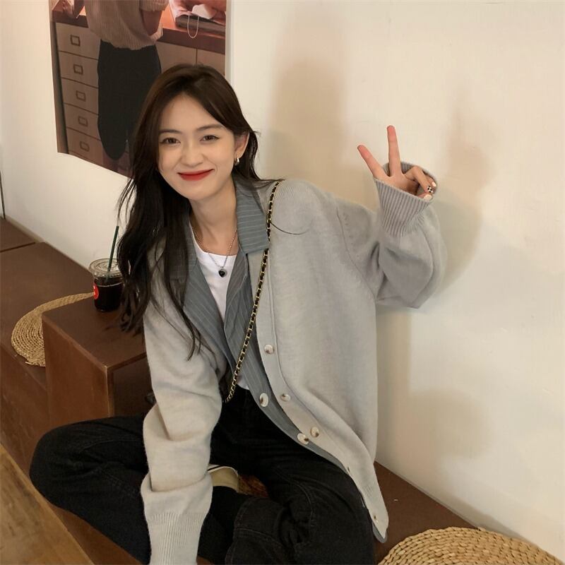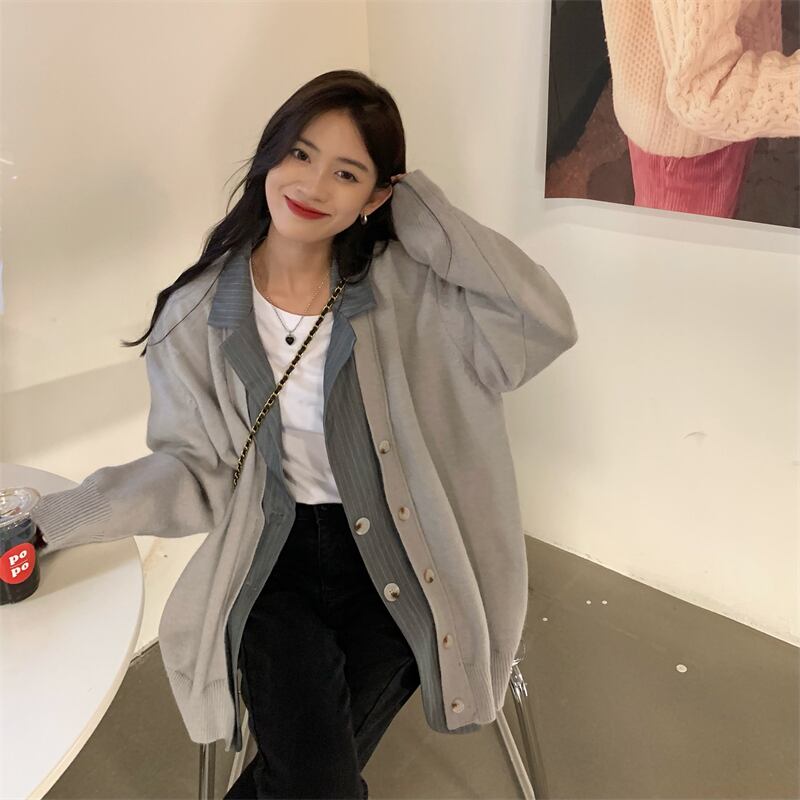 ニット アウター 重ね着風襟付きカーディガン 長袖 萌袖 Vネック 前開き かわいい シンプル カジュアル おしゃれ 大人可愛い ガーリー 無地 春 秋 レディース OL 学生 デート お出かけ 普段使い 韓国系 ファッション モテ ゆったり グレー カーキ