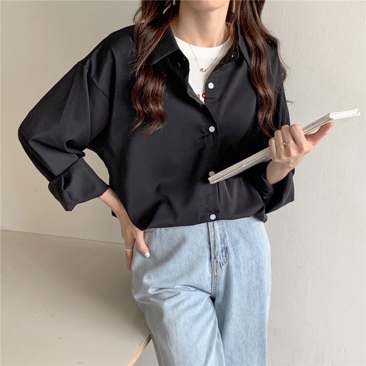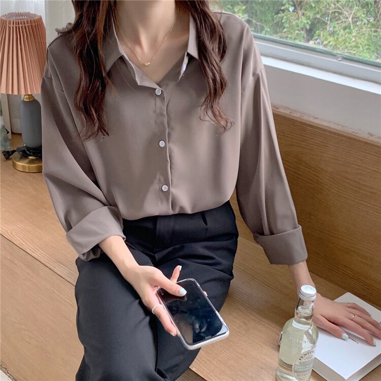 トップス レディース シャツ ブラウス ミディアム丈 袖あり 長袖 襟付き きれいめ シンプル 大人 上品 おしゃれ かっこいい こなれ感 ラフ とろみ感 抜け感 クール ワンサイズ ホワイト 白 ブラック 黒 ブラウン 茶 グレー 灰色 ライトベージュ カーキ ブルー 青 無地 10代 20代 30代 40代 50代 60代 オフィス ビジネス OL 通勤 学生 通学 お出かけ 休日 旅行 着回し 普段使い 重ね着 お揃い 双子 韓国 オルチャン