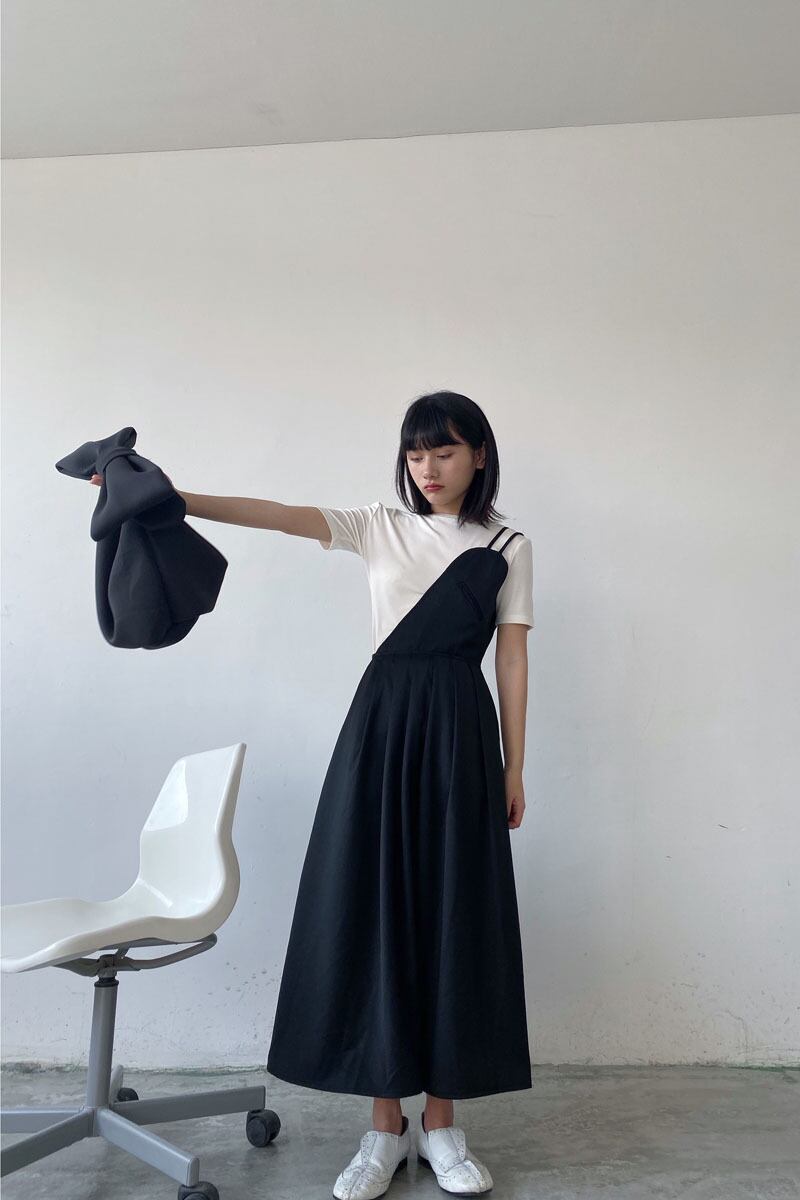 キャミソールワンピース ワンピース 白シャツ 袖なし フレア 切り替えデザイン シンプル こなれ感 個性的 モード系 無地 オールシーズン お出かけ 着回し 重ね着 トレンド 黒 ブラック