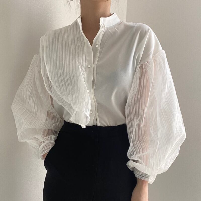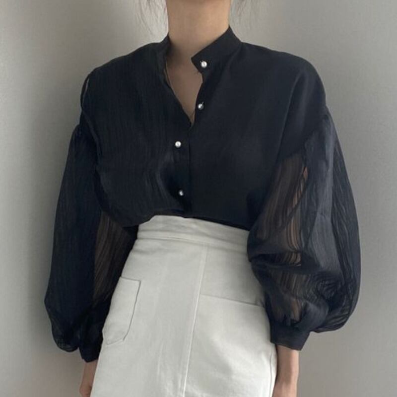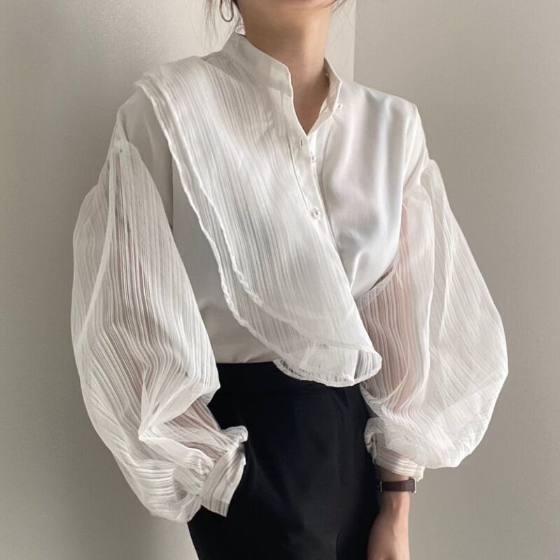 シャツ ブラウス 長袖 スタンドカラー シフォン フリル 透け感 大人可愛い きれいめ 上品 こなれ感 ガーリー セクシー エレガント 無地 オールシーズン OL デート お出かけ 休日 着回し 普段使い 重ね着 モテ ホワイト ブラック