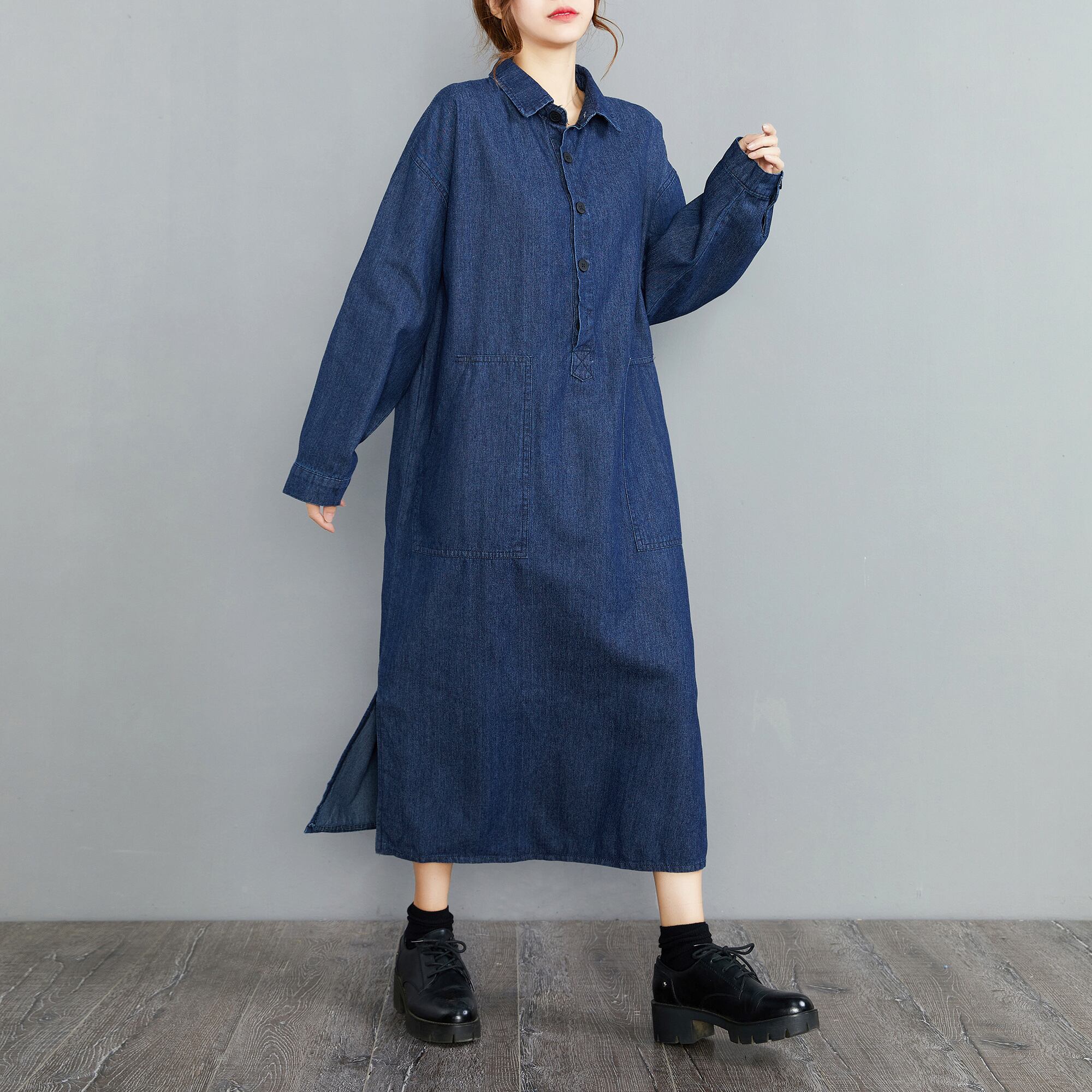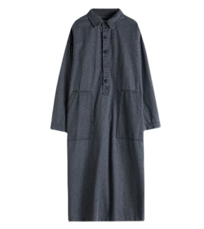 デニムワンピース シャツワンピース ロング丈 長袖 Aライン ブルーデニム シンプル カジュアル かっこいい こなれ感 ラフ メンズライク ボーイッシュ ルーズ 無地 春 秋 冬 お出かけ 休日 アウトドア 着回し 普段使い 重ね着 体系カバー 大きいサイズ 大きめ ゆったり ゆる ブルー グレー