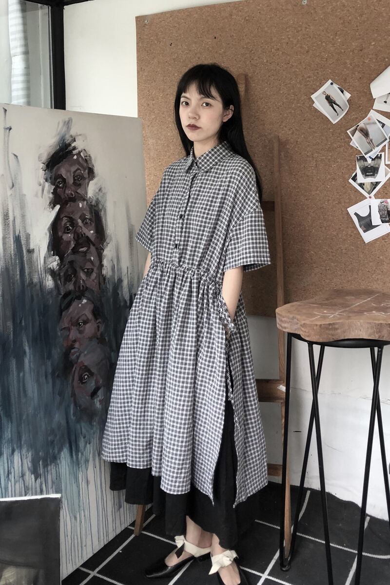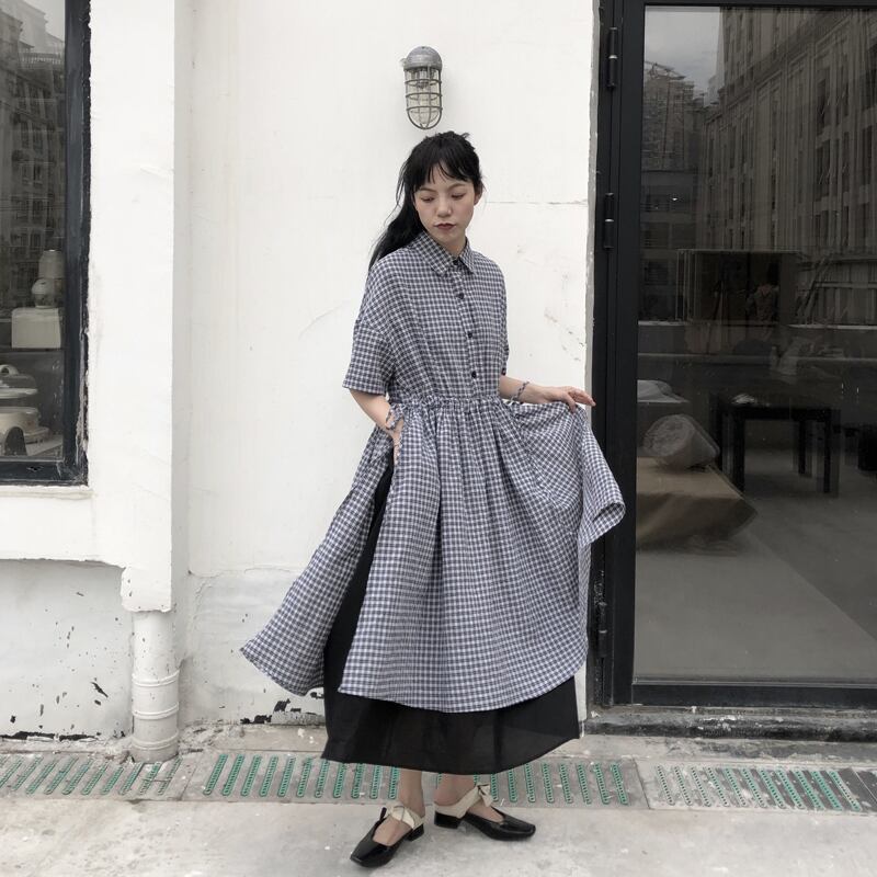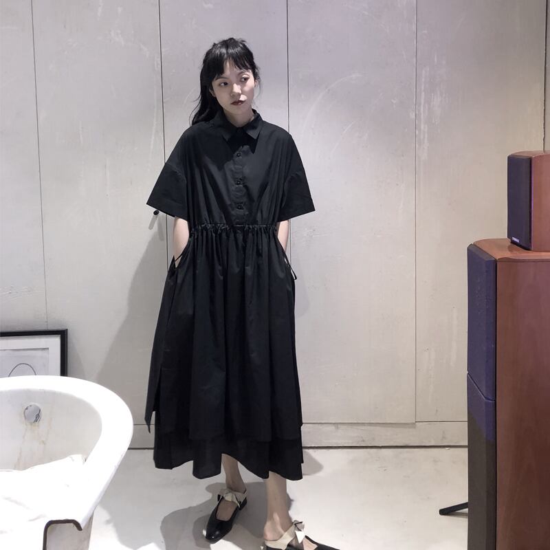 シャツワンピース ロング丈 半袖 襟付き Aライン ウエストリボン かわいい ガーリー 無地 格子柄 春 夏 秋 学生 デート お出かけ 休日 普段使い 楽ちん 体系カバー ブラック