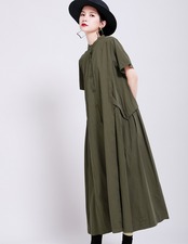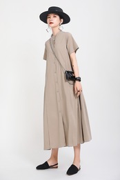 シャツワンピース ロング丈 半袖 スタンドカラー ワイド Aライン 切り替えデザイン おしゃれ かっこいい こなれ感 ラフ メンズライク ボーイッシュ 無地 春 夏 秋 お出かけ 休日 着回し 普段使い 楽ちん 体系カバー ブラック グリーン ベージュ カーキ