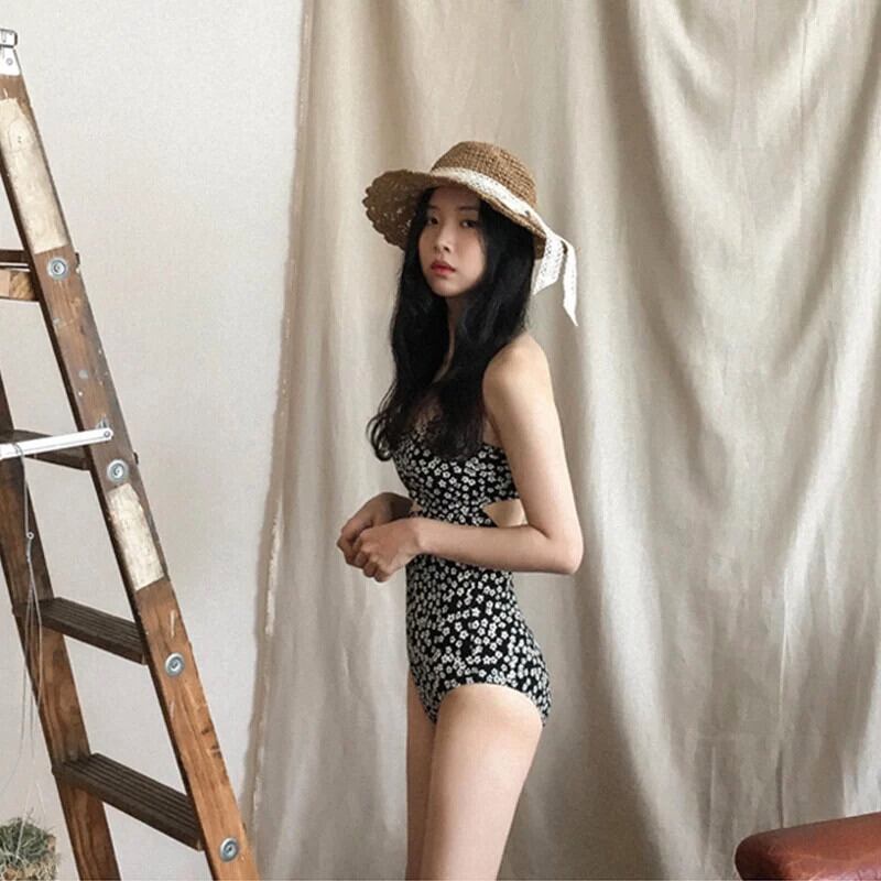 水着 スイムウェア バンドゥビキニ ワンピース水着 ワンピース 盛れる 大人可愛い きれいめ シンプル おしゃれ レトロ 花柄 小花柄 フラワー レディース 脚長 着痩せ ブラック