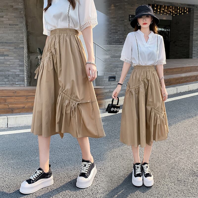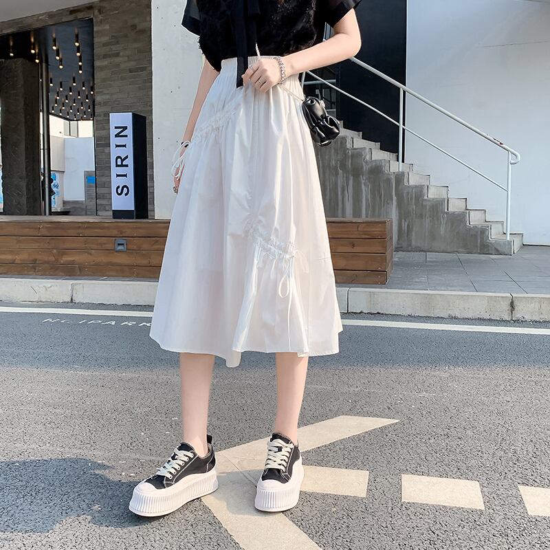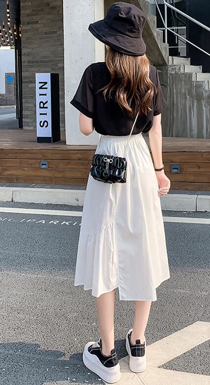 スカート ミモレ丈 フレア アシンメトリー ウエストゴム かわいい シンプル カジュアル ガーリー 無地 オールシーズン 学生 お出かけ 休日 着回し 普段使い お揃い ホワイト ブラック ベージュ