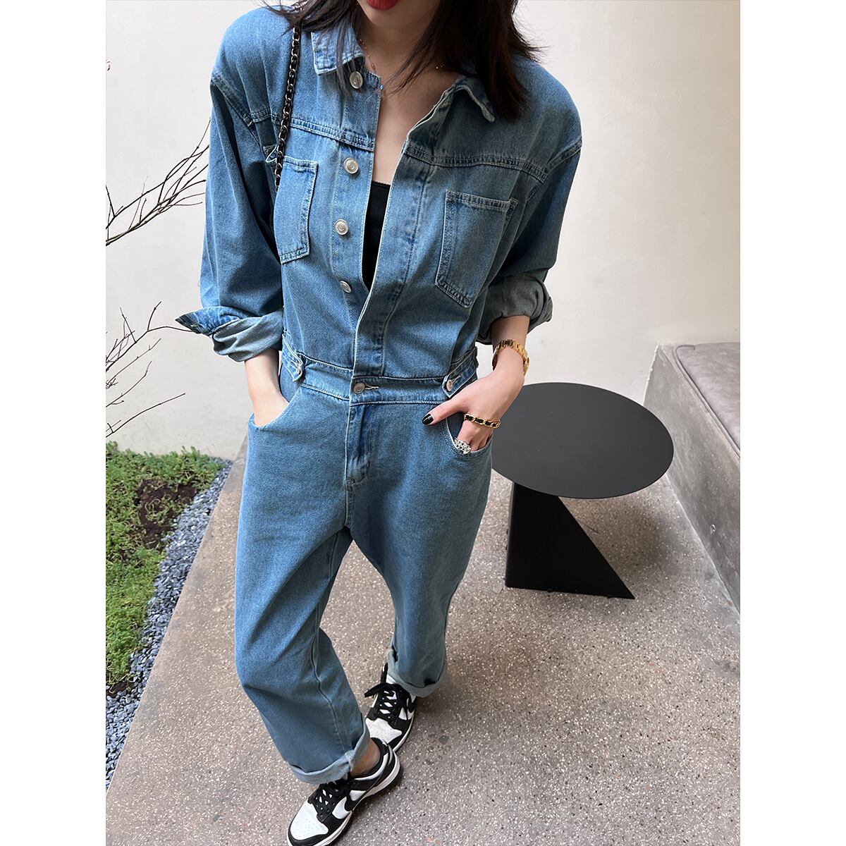 オールインワン Gジャン Gパン デニムパンツ 長袖 デニム ブルーデニム カジュアル かっこいい こなれ感 ラフ メンズライク ボーイッシュ 無地 春 秋 冬 お出かけ 休日 アウトドア リゾート 旅行 着回し 普段使い ダメージ ブルー