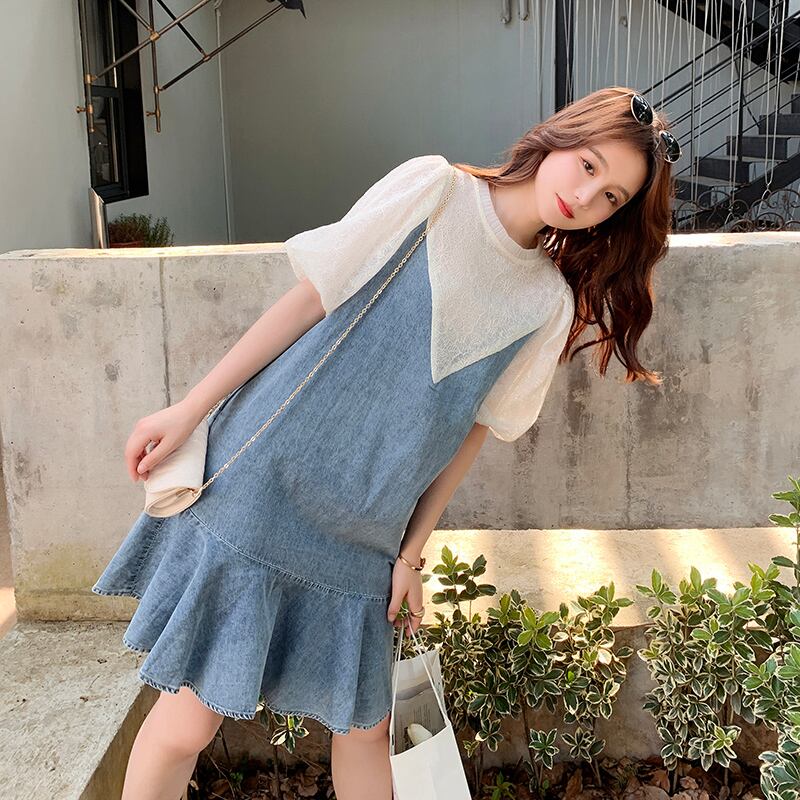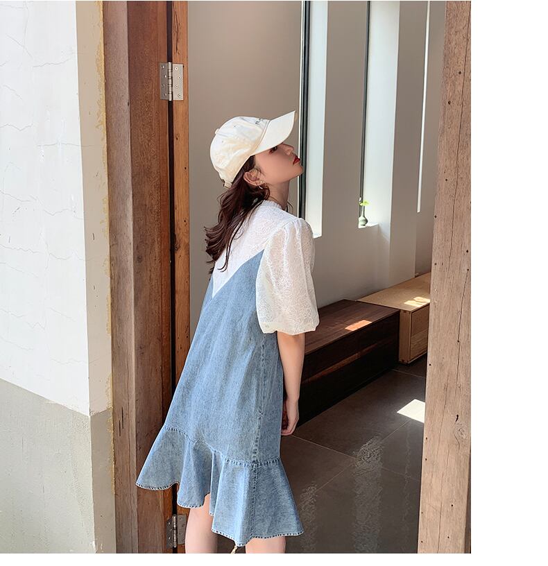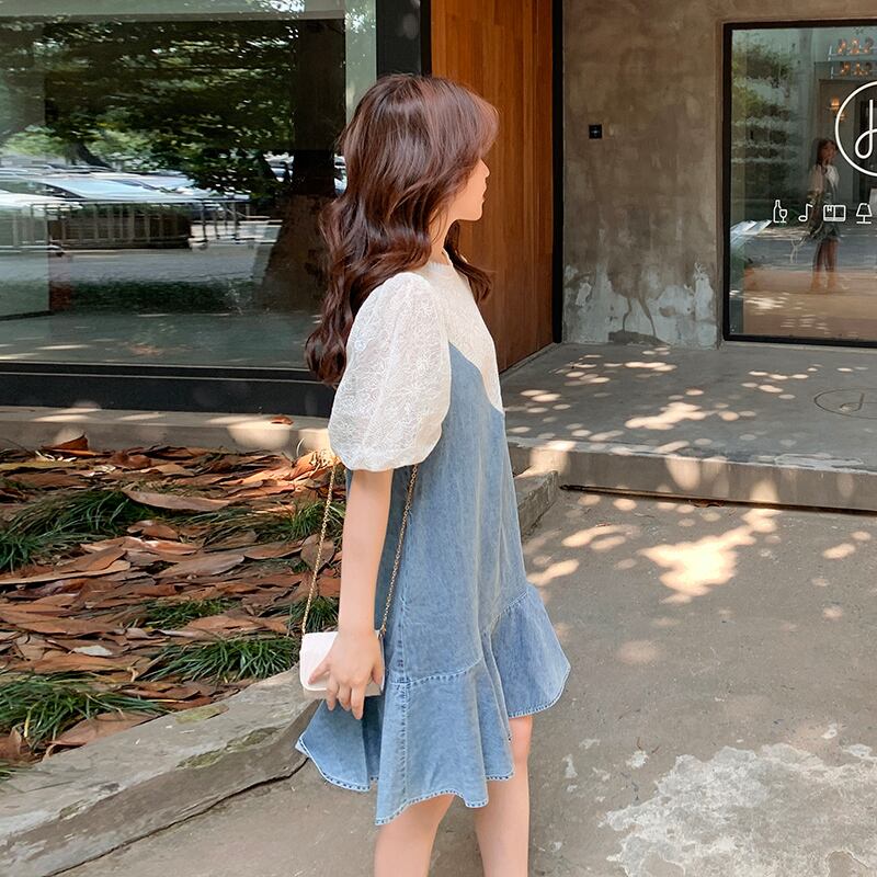 ワンピース レディース フレアスカート ミニ丈 袖あり パフスリーブ ボリューム袖 ラウンドネック 襟なし フレア Aライン 切り替えデザイン ドッキング かわいい おしゃれ ラブリー キュート ガーリー カジュアル 存在感 S M L XL 白 ホワイト ブルー 青 ブルーデニム レース 無地 春 夏 10代 20代 女の子 マタニティ ママ 学生 通学 デート お出かけ 女子会 休日 アウトドア イベント リゾート 旅行 海 プール 普段使い 韓国 オルチャン 美脚 脚長 体型カバー