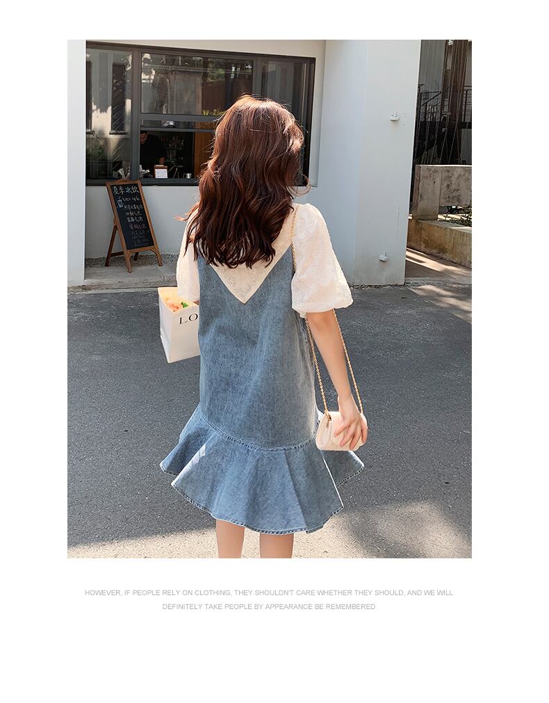 デニムビスチェワンピと半袖レースカットソーの異素材MIXワンピ。