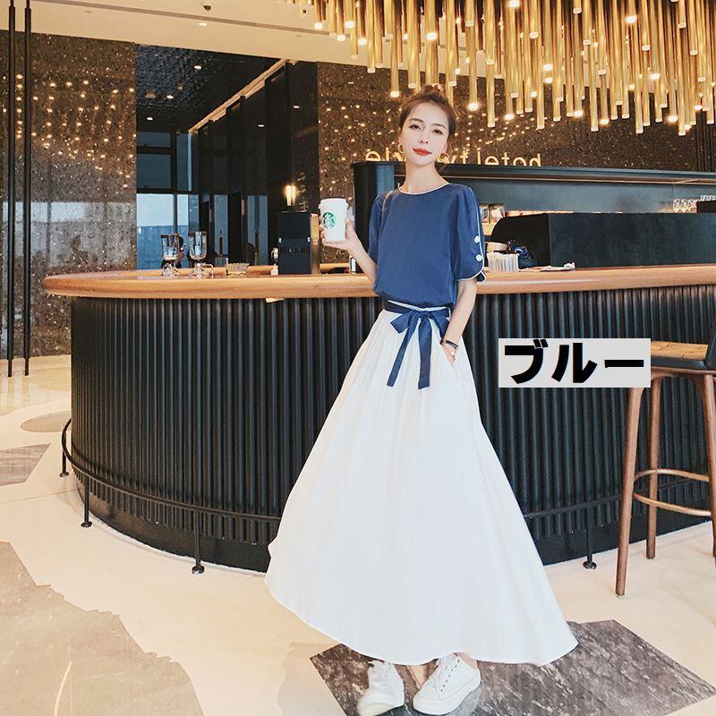 ワンピース レディース フレアワンピース ロング丈 袖あり 半袖 ラウンドネック 襟なし フレア Aライン 切り替えデザイン ドッキング リボン ウエストリボン ウエストゴム ツーピース風 かわいい 大人可愛い きれいめ 上品 おしゃれ レトロ 大人女子 こなれ感 キュート とろみ感 S M L XL ゆる ブルー 青 白 ホワイト グリーン 緑 ピンク 春 夏 20代 30代 40代 50代 ママ 通学 学生 デート お出かけ 女子会 休日 イベント リゾート 旅行 体型カバー 普段使い
