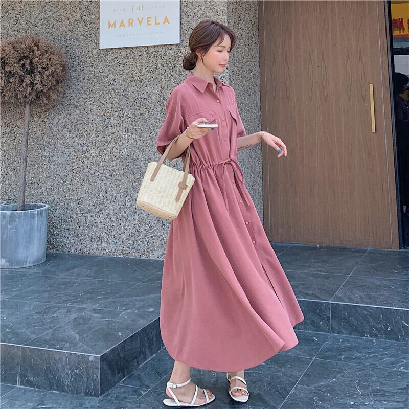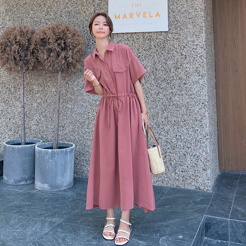 ワンピース レディース シャツワンピース ロング丈 袖あり 5分袖 五分袖 襟付き フレア Aライン ドロストデザイン ウエストリボン ウエストマーク ポケット 大人可愛い きれいめ シンプル カジュアル 上品 おしゃれ お洒落 こなれ感 抜け感 S M L ダスティピンク 濃緑 グリーン 春 夏 秋 20代 30代 40代 50代 60代 ママ 学生 通学 デート お出かけ 女子会 休日 イベント リゾート 旅行 着回し 普段使い 重ね着 楽ちん