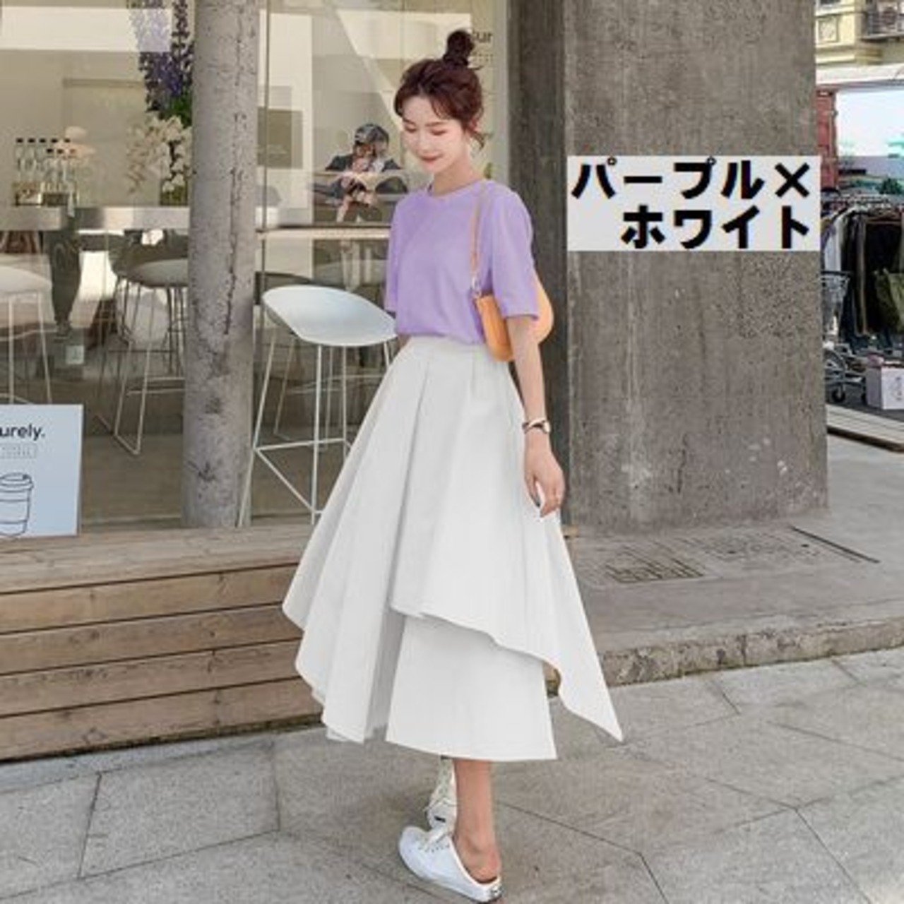 セットアップ レディース 白トップス Tシャツ フレアスカート ロングスカート ロング丈 袖あり 半袖 ラウンドネック フレア 上下セット 2点セット かわいい シンプル カジュアル おしゃれ こなれ感 S M L XL 白 ホワイト ベージュ 黒 ブラック パープル 紫 無地 夏 春 秋 10代 20代 30代 40代 50代 ママ 学生 通学 デート お出かけ 休日 アウトドア イベント 旅行 着まわし 普段使い 重ね着 韓国 オルチャン 楽ちん