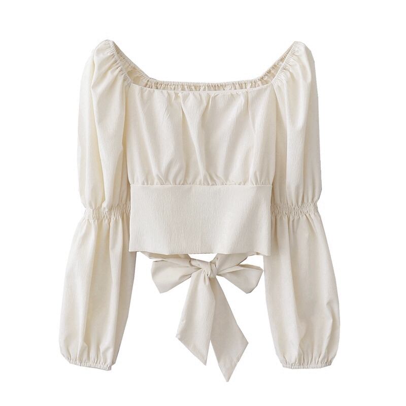 トップス ブラウス カットソー 白トップス ショート丈 袖あり 長袖 ホルンスリーブ スクエアネック 襟なし リボン ウエストリボン かわいい シンプル おしゃれ お洒落 キュート ガーリー 無地 春 夏 秋 10代 20代 レディース 女性用 学生 通学 デート お出かけ 休日 パーティー イベント ガーデン レストラン 着回し 普段使い お揃い 双子 オルチャン ファッション コーデ スタイル モテ トレンド インスタ映え S M L 白 ホワイト 黒 ブラック クリーム