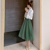 シンプルな長袖白シャツと膝丈フレアスカートのセットアップ。