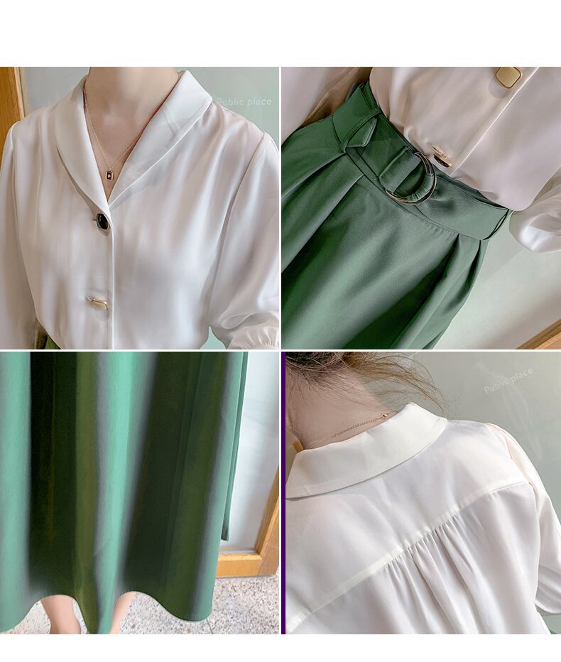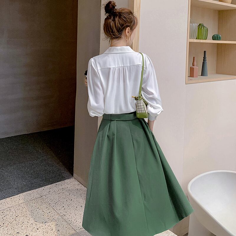 セットアップ レディース 白シャツ ブラウス フレアスカート タックスカート ミディアム丈 膝丈 ひざ丈 膝下 袖あり 長袖 襟付き フレア Aライン ベルト ウエストマーク 2点セット 上下セット ツーピース 大人可愛い きれいめ シンプル 上品 おしゃれ 大人女子 とろみ感 S M L XL 白 ホワイト グリーン 緑 無地 春 秋 20代 30代 40代 50代 ママ オフィス ビジネス OL 通勤 学生 通学 デート お出かけ 女子会 休日 イベント 旅行 着回し 普段使い