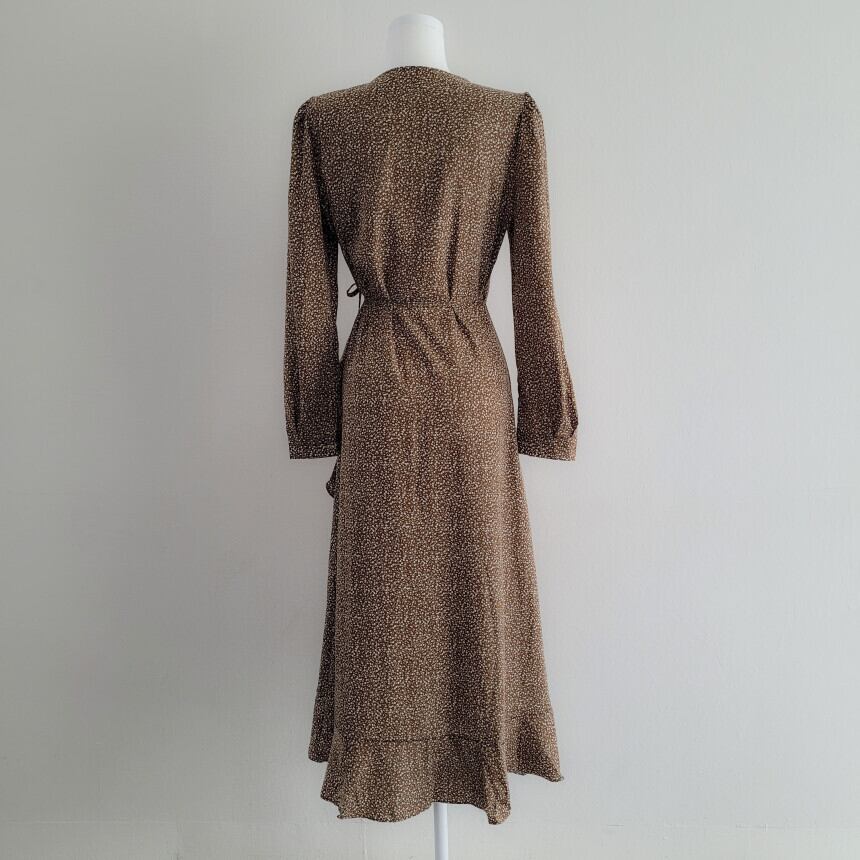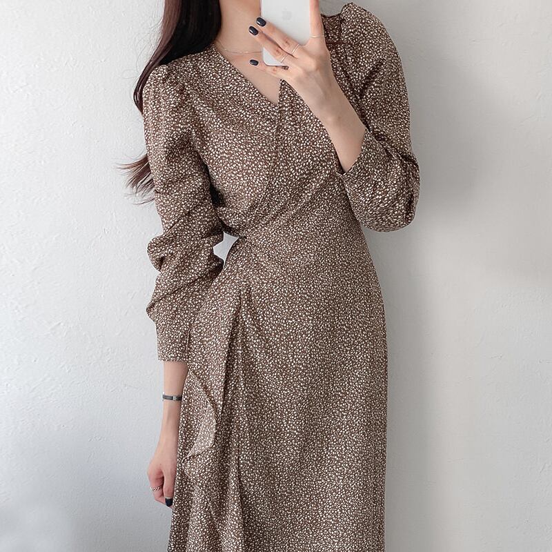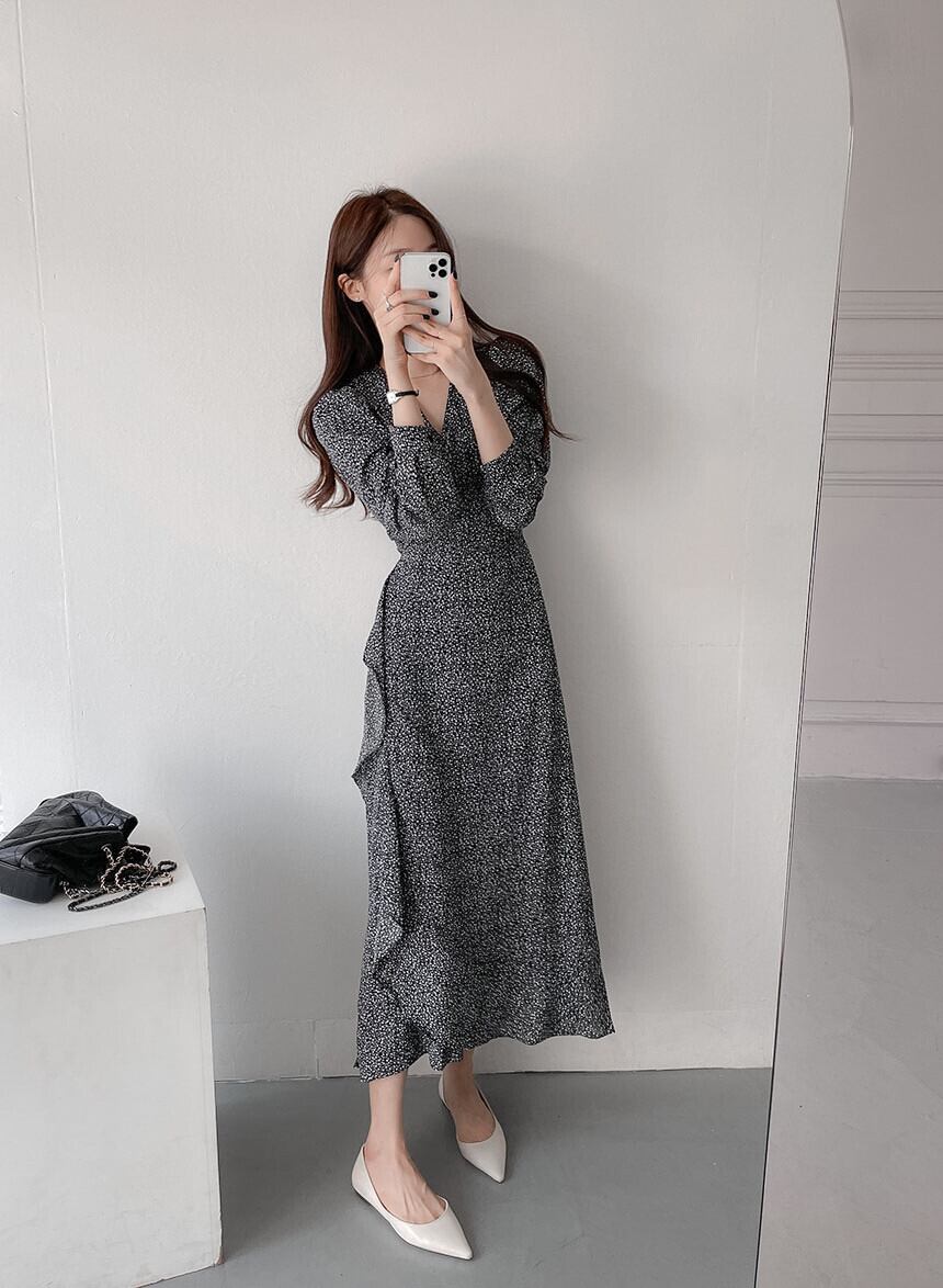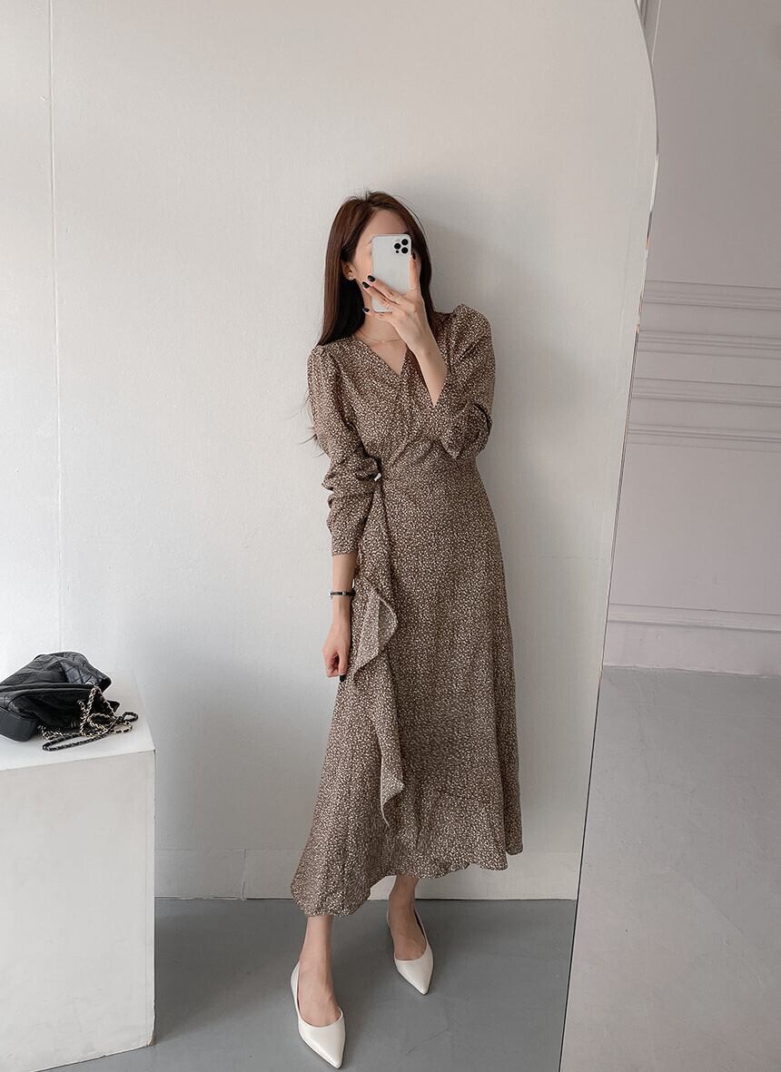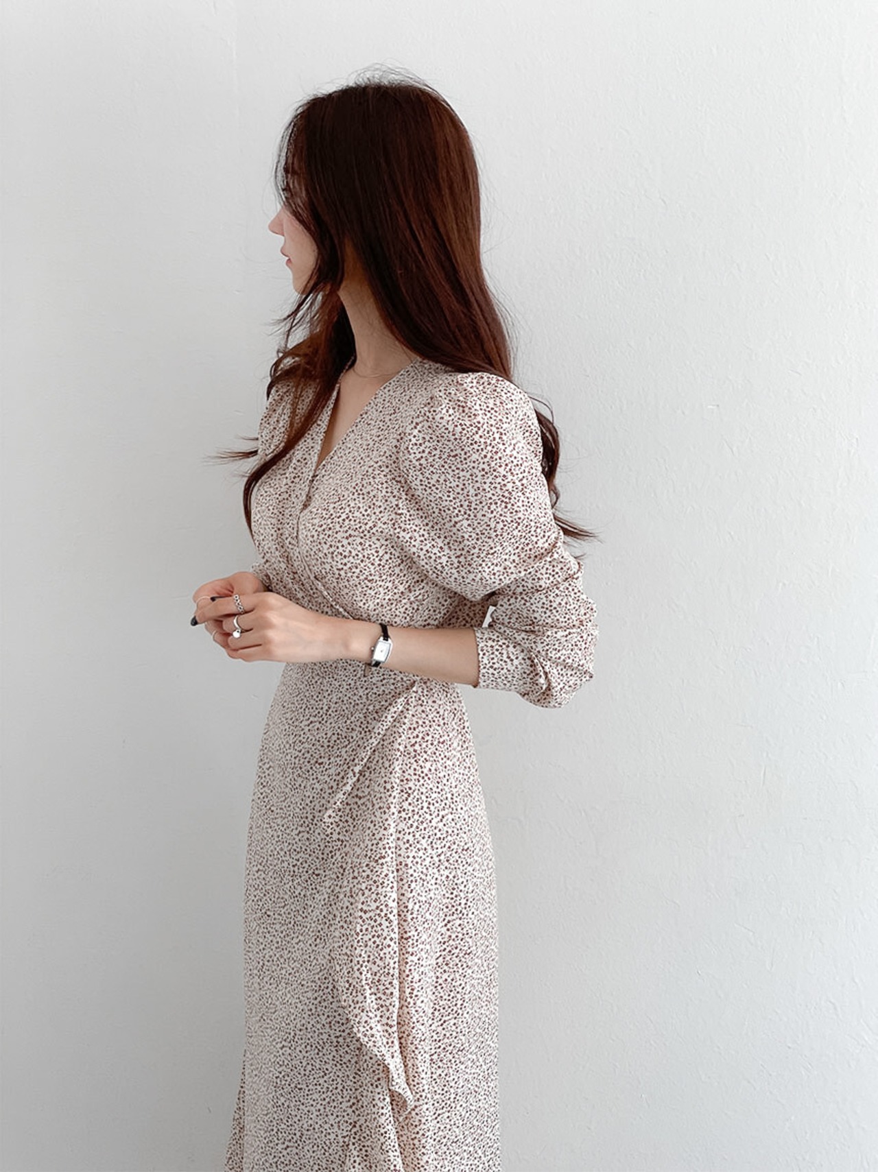 ワンピース レディース フレアワンピース ロング丈 袖あり 長袖 パフスリーブ カシュクール 襟なし Vネック セミフレア マーメイド リボン 大人可愛い きれいめ 上品 おしゃれ お洒落 大人女子 こなれ感 とろみ感 S M L 白 ホワイト 茶色 ブラウン 黒 ブラック 小花柄 フラワー 花柄 春 秋 20代 30代 40代 50代 ママ オフィス ビジネス OL 通勤 学生 通学 デート お出かけ 女子会 休日 パーティー イベント リゾート 旅行 モテ 普段使い 韓国 オルチャン