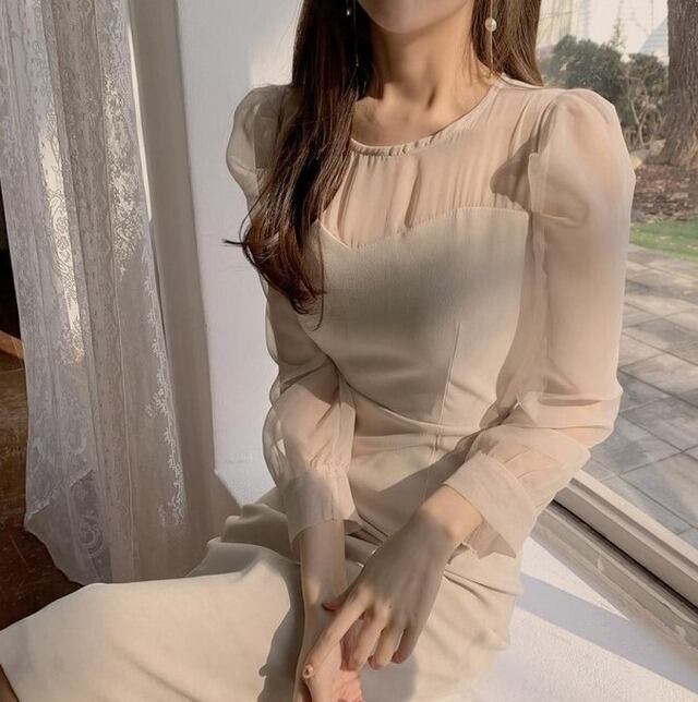 ワンピース レディース タイトワンピース 膝丈 ひざ丈 膝下 袖あり 七分袖 7分袖 パフスリーブ ラウンドネック 襟なし タイト ストレート Iライン 切り替えデザイン ドッキング シフォン バックスリット 透け感 シースルー 大人可愛い きれいめ 上品 おしゃれ お洒落 大人女子 エレガント 主役級 存在感 とろみ感 S M L XL 無地 ベージュ 春 夏 秋 誕生日 謝恩会 20代 30代 40代 デート お出かけ 女子会 パーティー 休日 イベント 美脚 脚長 モテ 韓国 オルチャン
