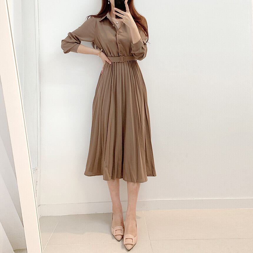 ワンピース レディース シャツワンピース S M L ブラウン 茶色 ベージュ 無地 プリーツ 春 秋 長袖 襟付き フロントボタン ミドル丈 ミドル ミディ丈 ミディ 膝丈 フレア Aライン ハイウエスト ウエストベルト 体型カバー 着やせ スタイルアップ ママ フェミニン きれいめ きれカジ カジュアル ナチュラル 上品 エレガント キュート ガーリー モテ シンプル ベーシック 定番 着回し 王道 万能 大人 大人可愛い 存在感 主役級 こなれ感 ぬけ感 デート お出かけ 休日 韓国 オルチャン