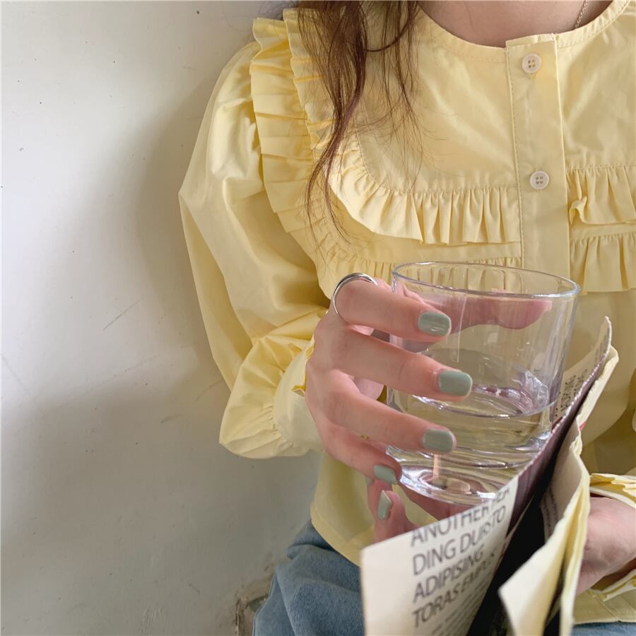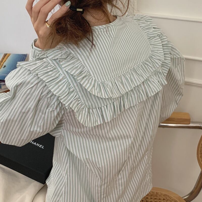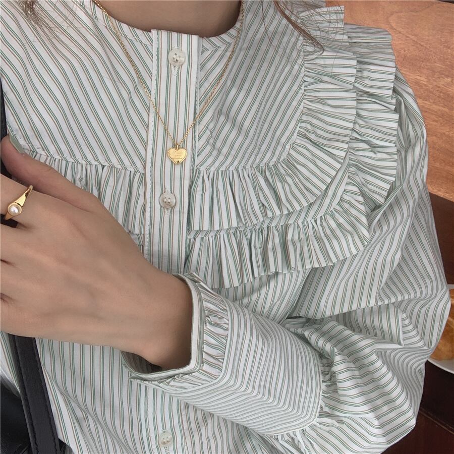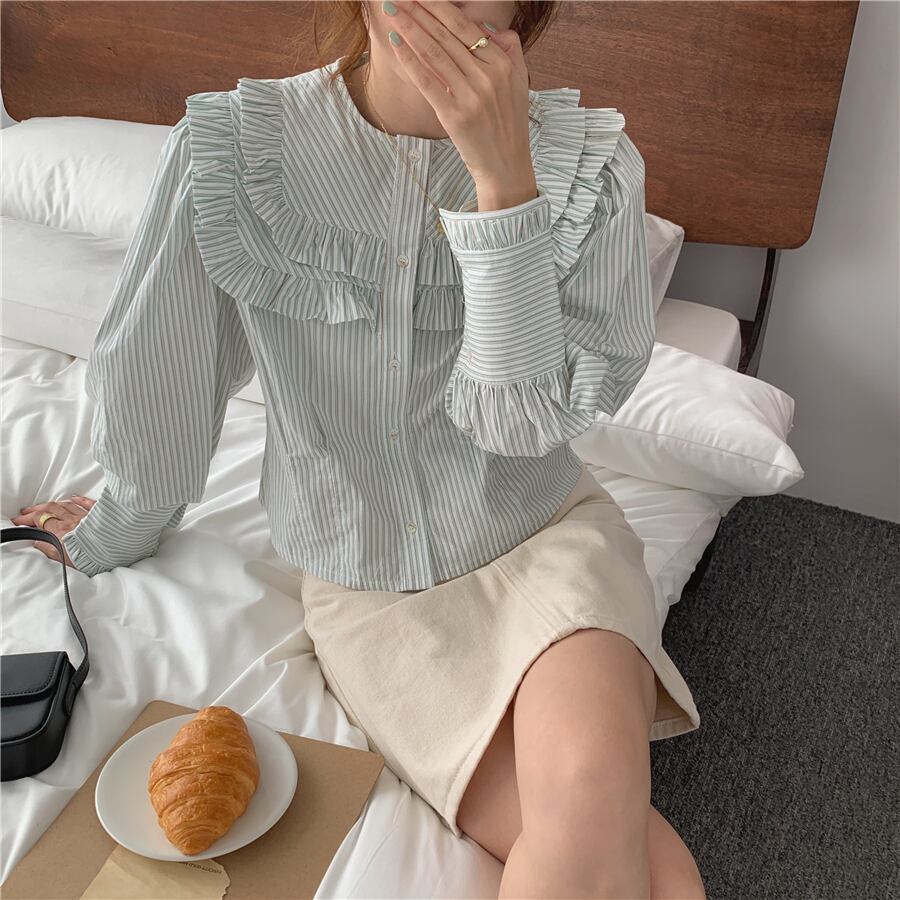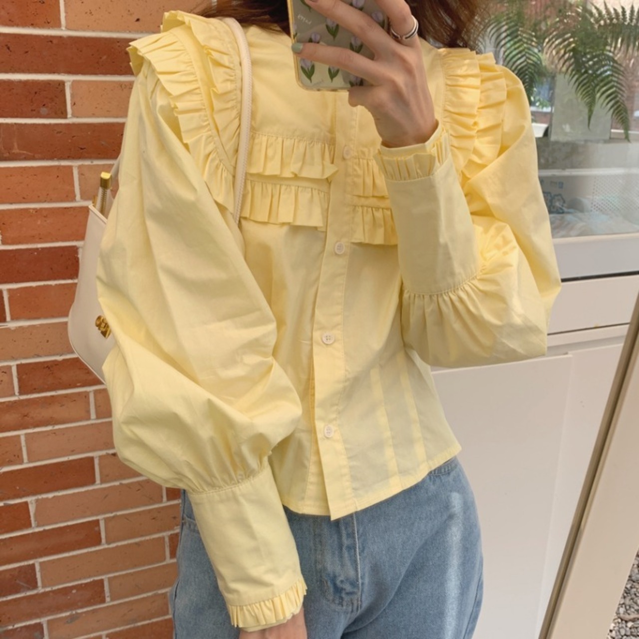 トップス レディース シャツ ショート丈 袖あり 長袖 パフスリーブ ラウンドネック 襟なし フリル 前開き かわいい きれいめ おしゃれ お洒落 ラブリー キュート ガーリー 主役級 存在感 S M イエロー 黄色 緑 グリーン ストライプ 春 秋 冬 10代 20代 30代 ママ 学生 通学 デート お出かけ 女子会 休日 旅行尾 イベント モテ 着回し 普段使い 重ね着 お揃い 双子 韓国 オルチャン