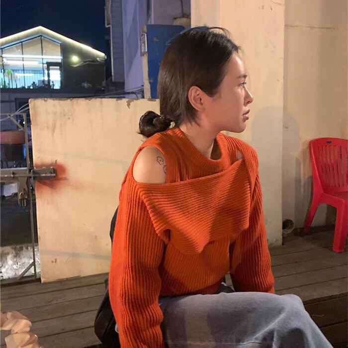 ニット レディース トップス セーター ワンサイズ フリーサイズ ライトブルー 青 ネイビー 紺 オレンジ 大人カラー くすみカラー 秋カラー 秋 冬 クルーネック オープンショルダー オフショルダー 変形 リブ 長袖 ボリューム袖 ショート丈 ショート コンパクト ヘルシー 肌見せ フェミニン ナチュラル カジュアル きれいめ きれカジ 大人 大人可愛い こなれ感 ぬけ感 デート 休日 お出かけ 万能 着回し シンプル ガーリー モテ キュート 存在感 主役級 学生 通学 韓国 オルチャン