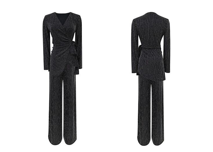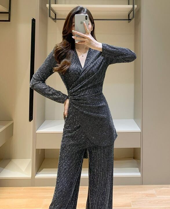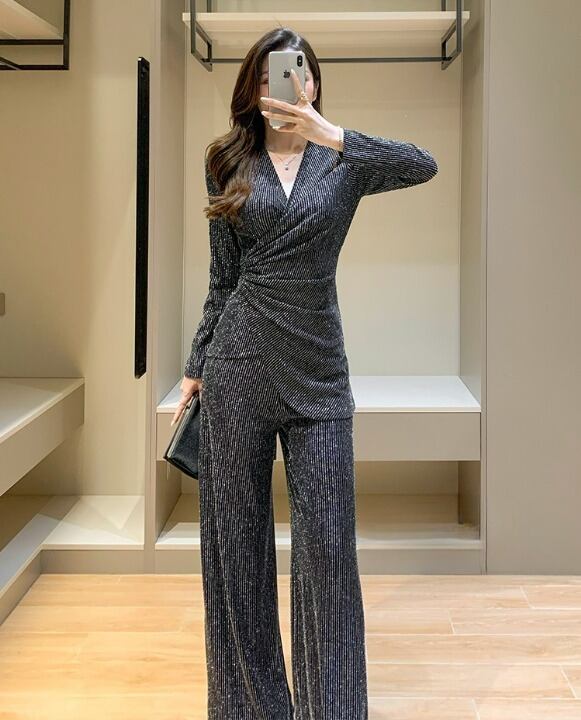 セットアップ レディース セット 2点セット ツーピース パンツスーツ 上下セット M L XL シルバー ストライプ 柄 大人カラー くすみカラー トップス カットソー Vネック 長袖 ウエストリボン ウエストベルト ボトムス パンツ ワイドパンツ ワイドレッグ フレア フェミニン 大人 きれいめ きれカジ カジュアル クール スタイリッシュ シック 上品 モード かっこいい 万能 着回し こなれ感 ぬけ感 存在感 主役級 韓国 オルチャン パーティー 二次会 謝恩会 お呼ばれ 華やか 衣装 女子会