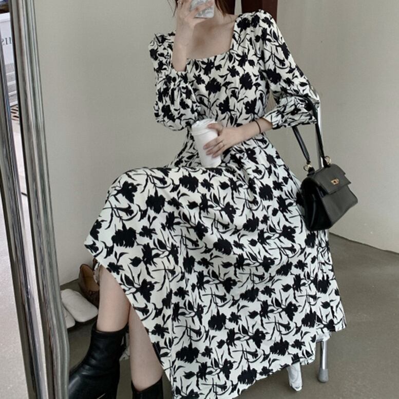 花柄ワンピース ワンピース レディース モノクロ花柄長袖ワンピース ドレス ロマンチック 花柄 スクエアネック 長袖 フラワー モノトーン パワースリーブ プリント ロングワンピース 白 黒 ホワイト ブラック ワンピドレス 大人可愛い きれいめ 上品 レトロ ガーリー エレガント フォーマル 春 夏 秋 冬 二次会 お呼ばれ オフィス ビジネス OL 通勤 学生 通学 デート お出かけ パーティー イベント 女子会 休日 旅行 リゾート 体型カバー 美脚 脚長 トレンド ゆったり インスタ映え