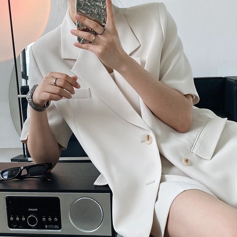 セットアップ スーツ ジャケット ショートパンツ ハーフパンツ レディース 半袖 大人女子 上下セット 2点セット ポケット パーティー エレガント カジュアル 10代 20代 30代 韓国 トレンド 今っぽ お洒落 オシャレ 高級感 オフィス ОL オフィスカジュアル 通勤