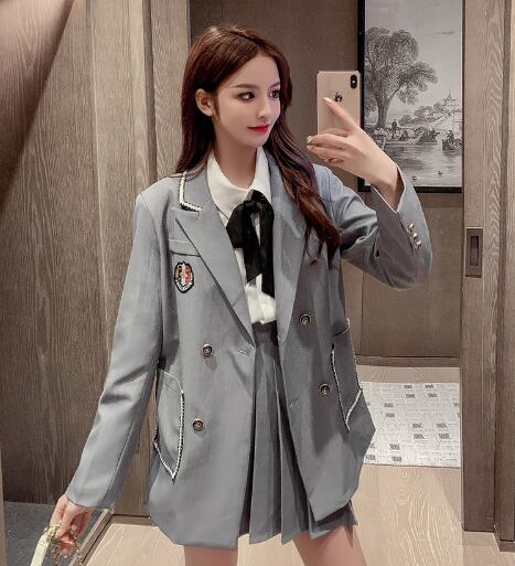 カレッジスタイル セットアップ 上着 スーツ コスプレ 制服 白シャツ プリーツスカート ミニ 長袖 リボン ポケット 3点セット スリーピース かわいい ラブリー キュート オールシーズン シーズンレス 入学式 卒業式 10代 女の子 学生 通学 お揃い 韓国系 オルチャン ファッション コーデ 体系カバー サイズ S M L XL 2XL ホワイト ブラック グレー モノトーン