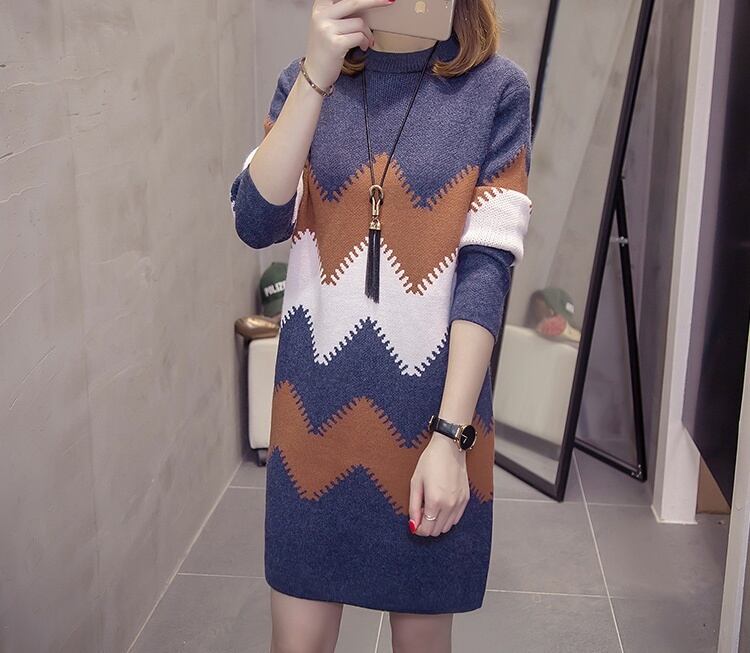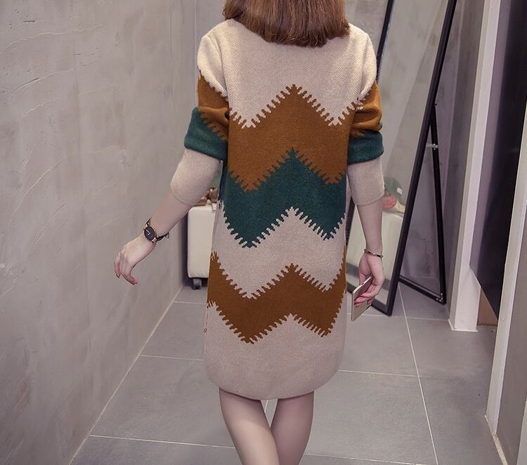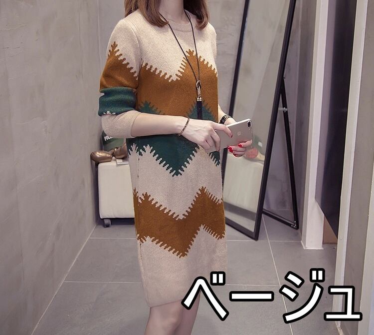 ニットワンピース ワンピース シェブロン柄 秋 冬 レディース 長袖 ひざ丈 ブルー グリーン 大きいサイズ 大きめ ストレート ストレートワンピース お洒落 オシャレ カーキ イエロー 20代 30代 40代 個性派 個性的 柄 ギザギザ