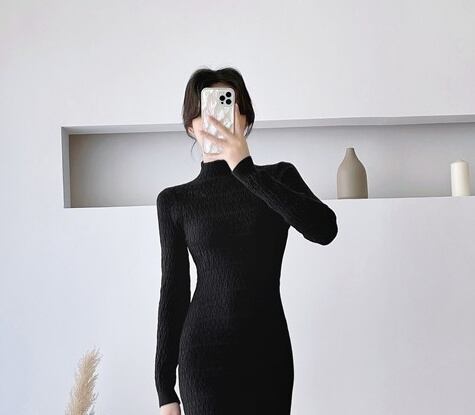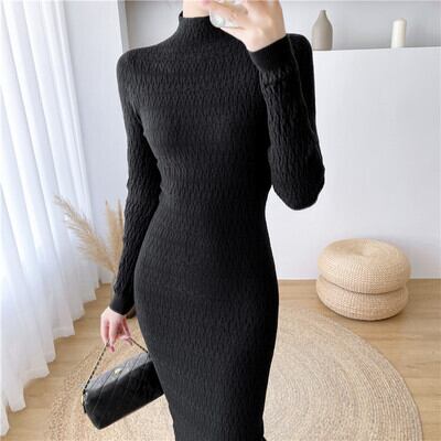 ロングワンピース シャーリング くしゅくしゅ ハイネック タイト 長袖 春 秋 冬 スリム 細見え おしゃれ オシャレクール セクシー エレガント ワンピドレス ニットワンピース 20代 30代 40代 きれいめ 大人女子 大人可愛い レディース 長袖 ひざ丈 膝下