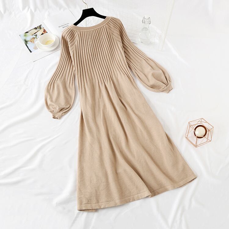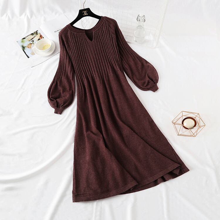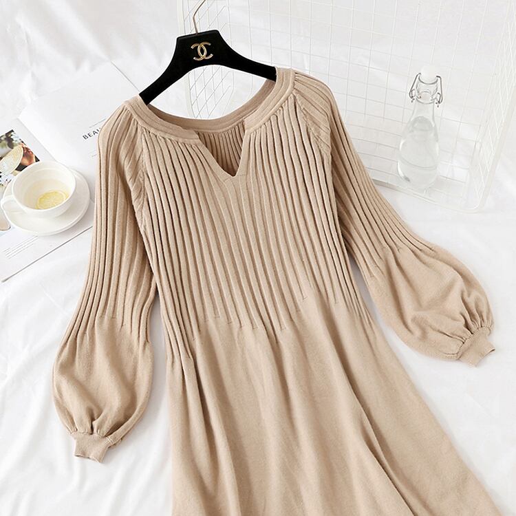ランタンスリーブ ニットワンピース Vネック ロング丈 レディース レトロ エレガント 主役 20代 30代 40代 大人女子 こなれ感 きれいめ 上品 ヴィンテージ アンティーク 可愛い おしゃれ オシャレ 大人可愛い ロングワンピース 春 秋 冬 膝下 無地 ふんわり
