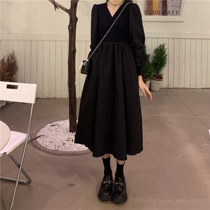 パフスリーブ ランタンスリーブ ロングワンピース Vネック 無地 ハイウエスト 春 秋 冬 トレンド 韓国 脚長 美脚 細見え 膝下 ひざ丈 ゆったり ОL 通勤 デート 女子会 披露宴 パーティー ドレス 黒 ブラック レディース Aライン 可愛い 大人可愛い 20代 30代 40代